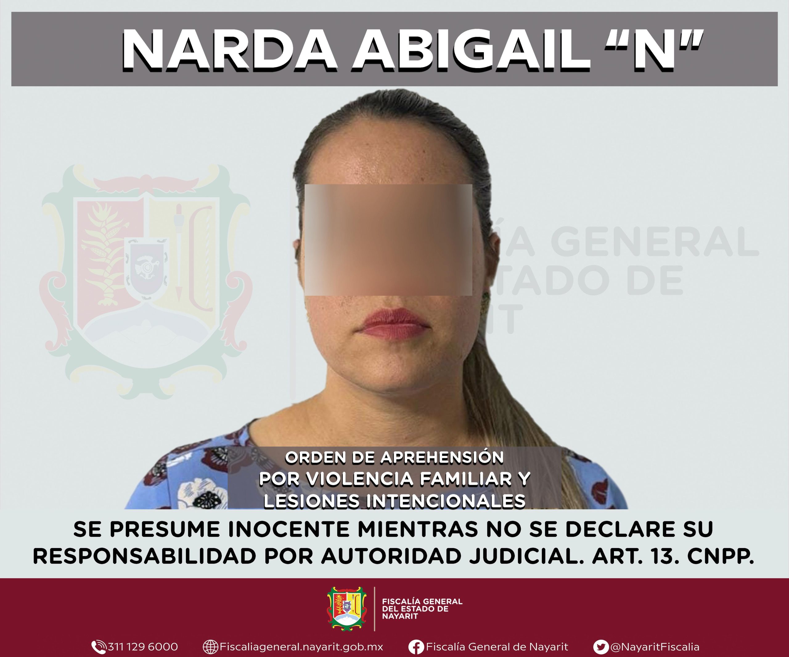 Elementos de la Agencia de Investigación Criminal de Nayarit ejecutaron una orden de aprehensión en la ciudad de Tepic contra Narda Abigail “N”, por su presunta participación en hechos que según apreciación de la ley encuadran los delitos de violencia familiar y lesiones, en agravio de una persona de sexo masculino de identidad reservada.