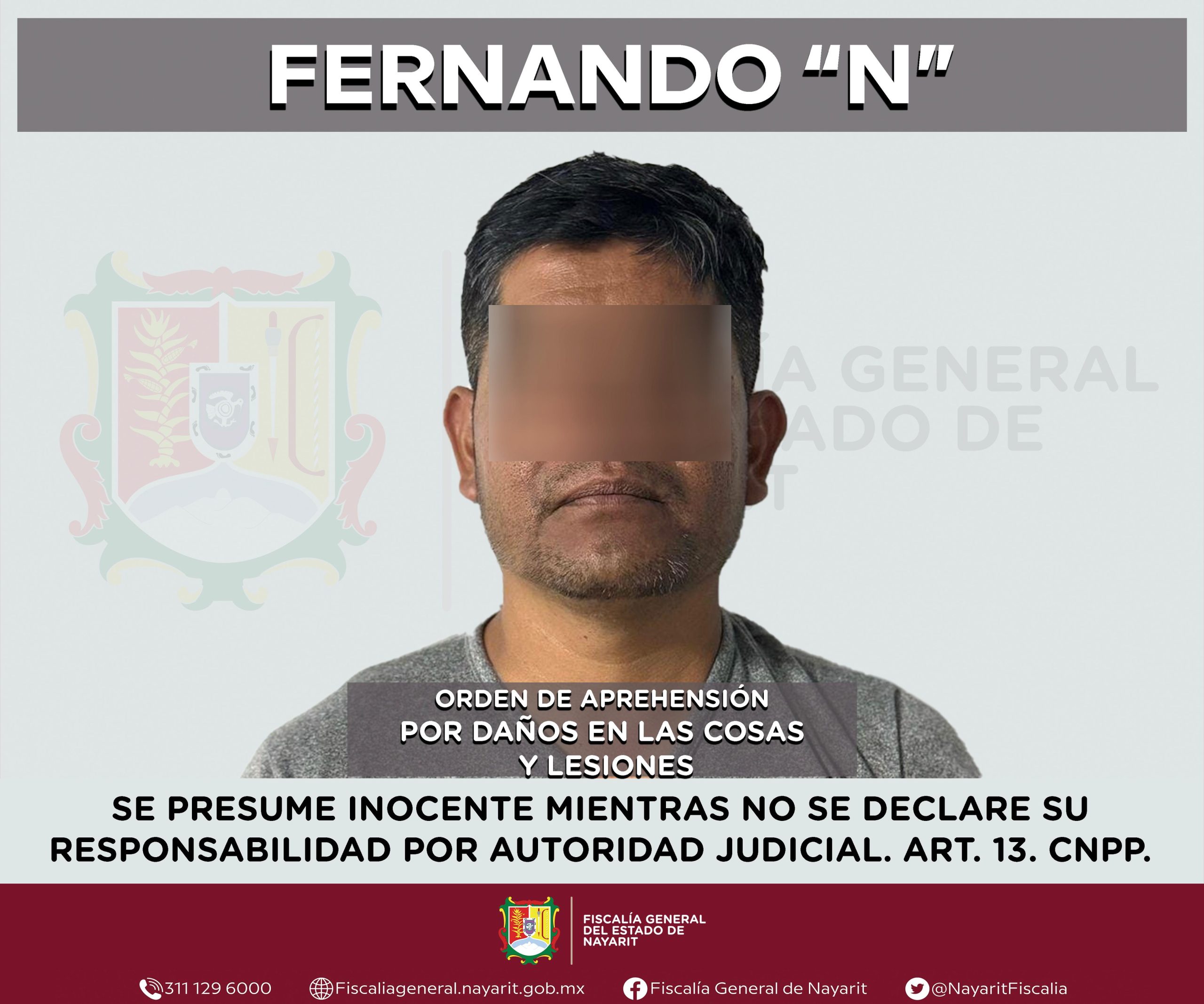La Fiscalía General de Nayarit a través de la Agencia de Investigación Criminal ejecutó una orden de aprehensión en la ciudad de Tepic contra Fernando “N”, por su probable participación en hechos que para la ley configuran los delitos de daños en las cosas y lesiones, cometidos en agravio de una persona de sexo masculino de identidad reservada.