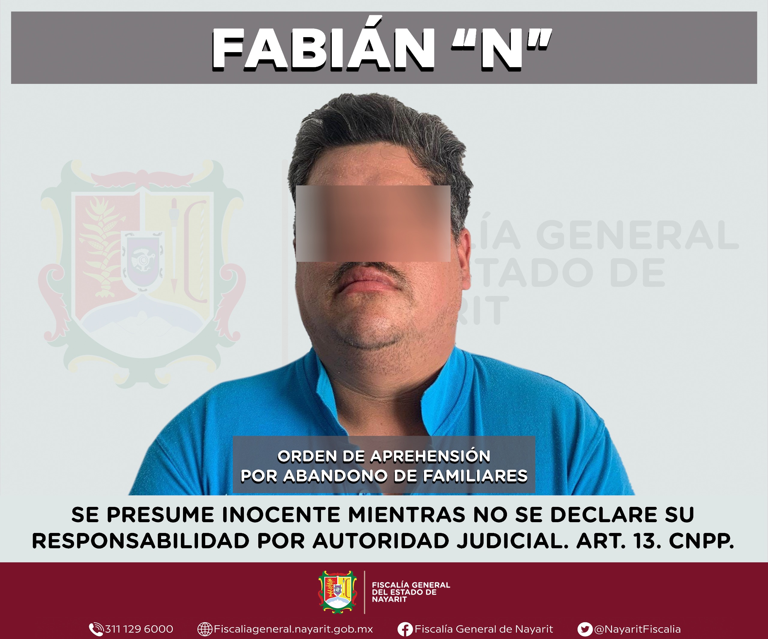 La Fiscalía General del estado de Nayarit informa que elementos de la Agencia de Investigación Criminal ejecutaron una orden de aprehensión en la ciudad de Tepic contra Fabián “N”, por su presunta participación en hechos que, conforme a la legislación vigente, configuran el delito de abandono de familiares en agravio de una niña cuya identidad se reserva para salvaguardar su privacidad y seguridad.