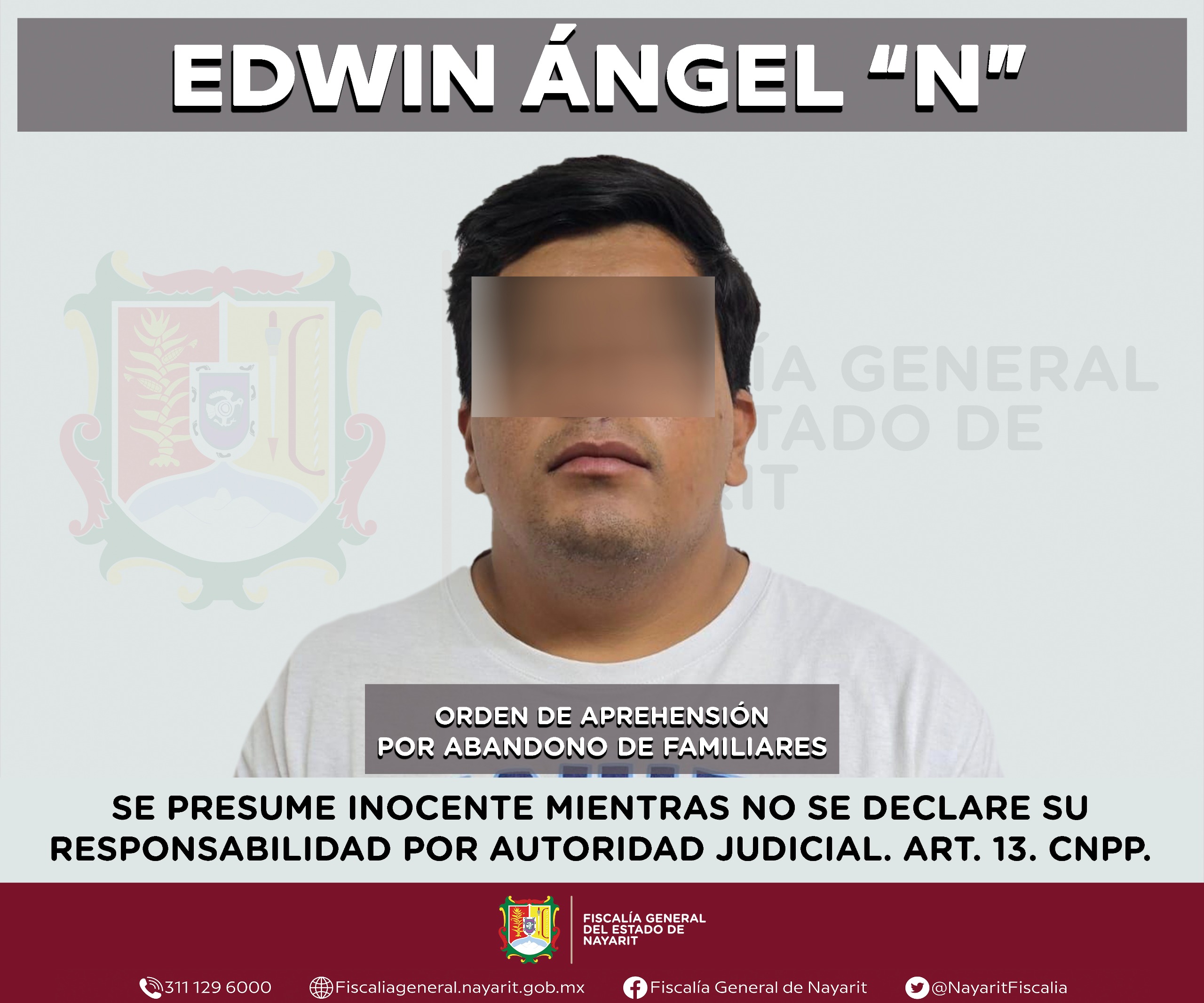 La Fiscalía General del estado de Nayarit informa que elementos de la Agencia de Investigación Criminal ejecutaron una orden de aprehensión contra Edwin Ángel “N”, por su probable participación en hechos que la ley tipifica como delito de abandono de familiares, cometido en agravio de un menor de edad cuya identidad se mantiene bajo reserva en atención a su derecho a la privacidad e integridad.