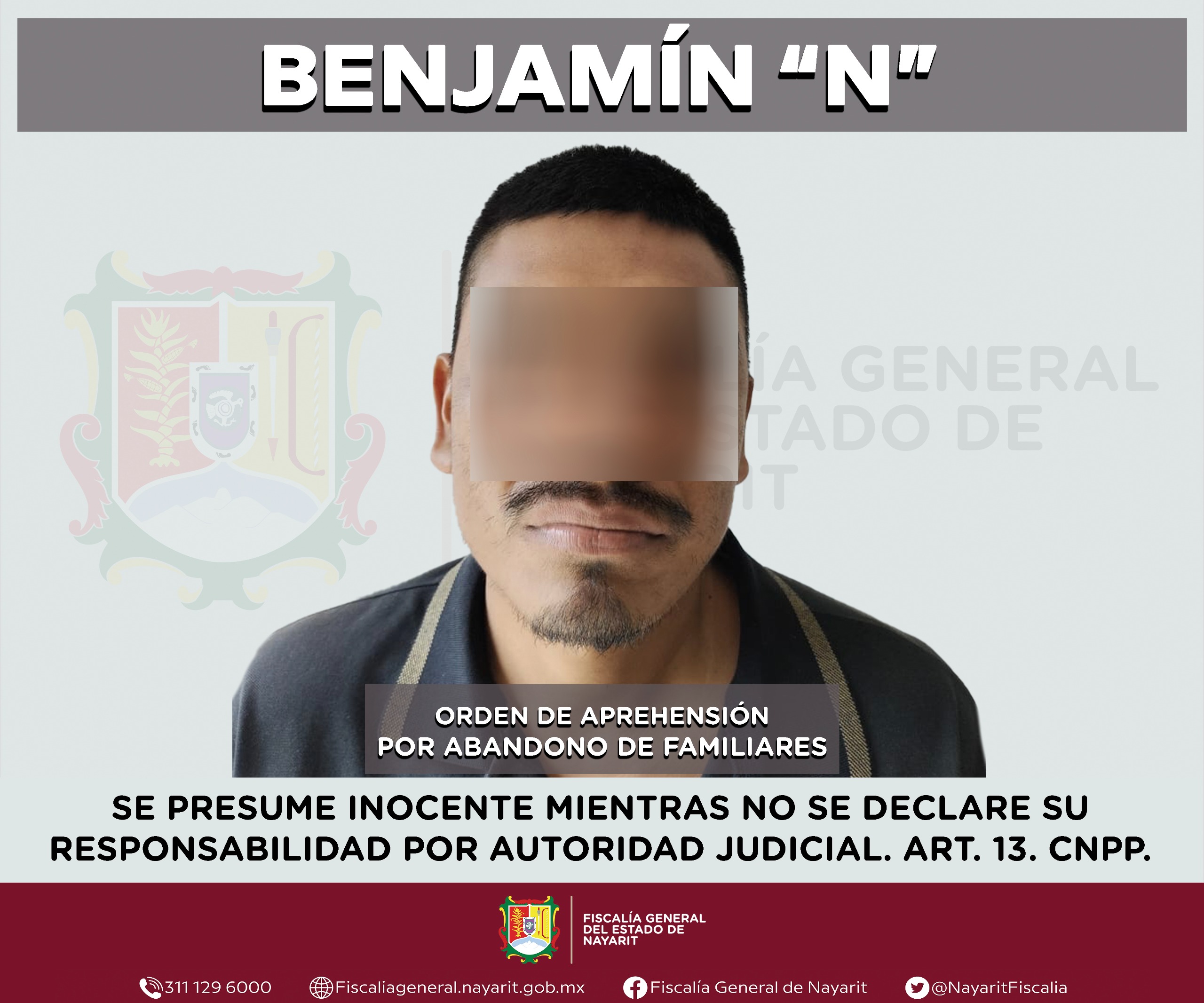 La Fiscalía General del estado de Nayarit informa que elementos de la Agencia de Investigación Criminal ejecutaron una orden de aprehensión en el municipio de Ixtlán del Río contra Benjamín “N”, por su presunta participación en hechos que, conforme a la legislación vigente, configuran el delito de abandono de familiares, cometido en agravio de dos menores de edad, cuyas identidades se reservan con el propósito de salvaguardar su privacidad e integridad.
