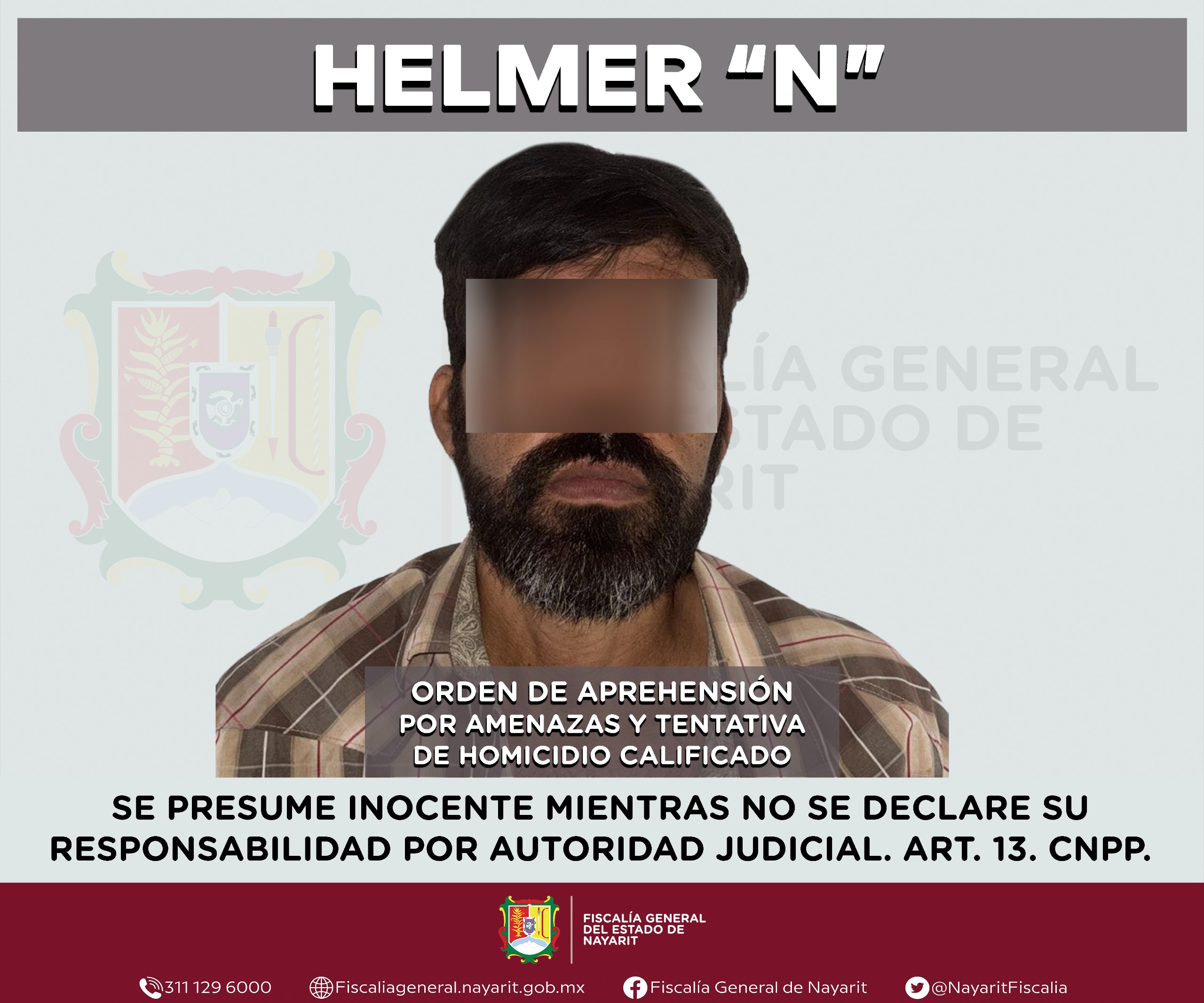 La Fiscalía General del estado de Nayarit informa que elementos de la Agencia de Investigación Criminal ejecutaron una orden de aprehensión en la localidad El Venado, municipio de Ruiz contra Helmer “N”, por su probable participación en hechos que la ley tipifica como delitos de amenazas y homicidio calificado en grado de tentativa, cometido en agravio de una persona de sexo masculino, cuya identidad se mantiene bajo reserva en atención a su derecho a la privacidad e integridad.