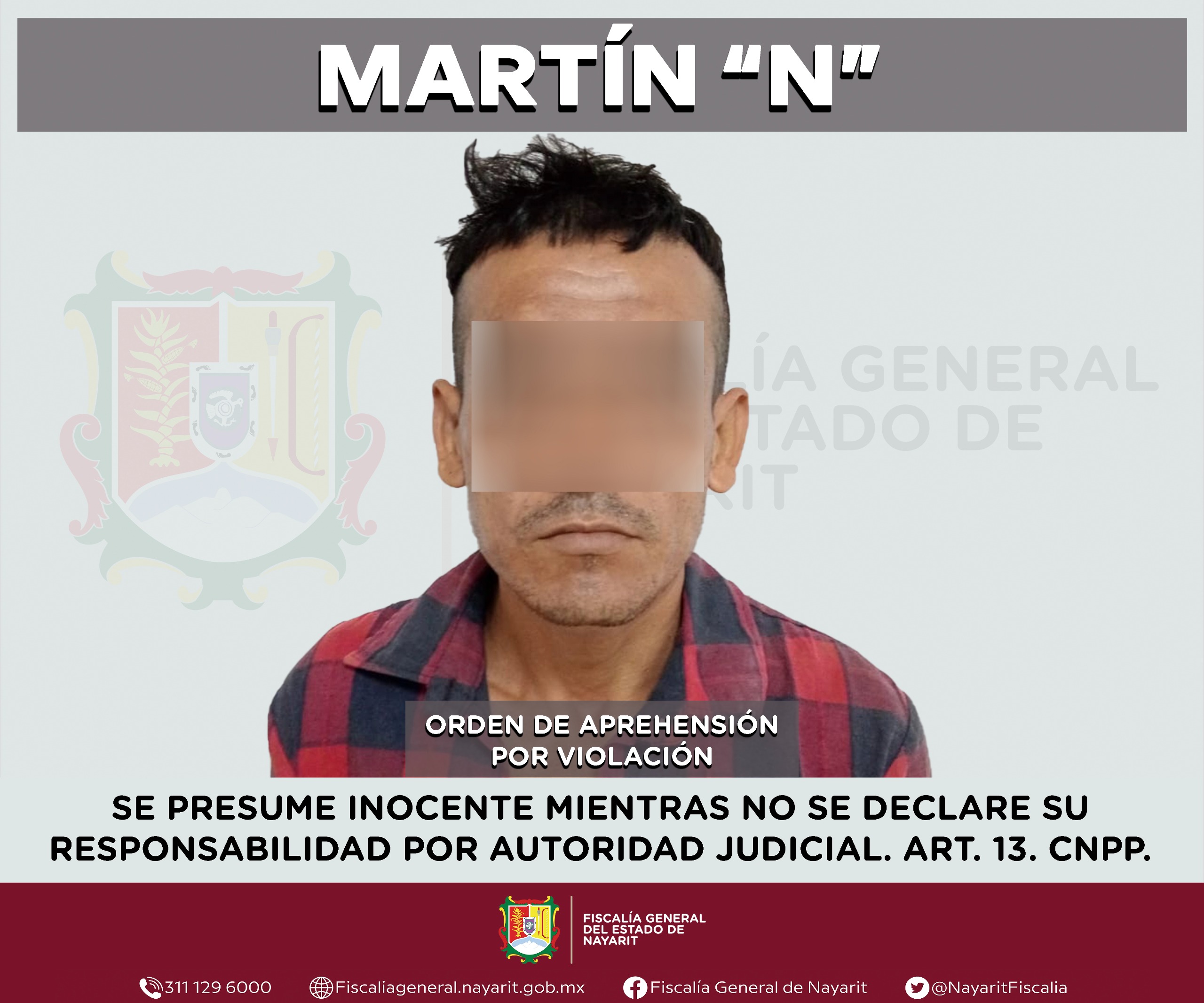 La Fiscalía General del estado de Nayarit informa que elementos de la Agencia de Investigación Criminal ejecutaron una orden de aprehensión en el municipio de San Blas contra Martín “N”, por su probable participación en hechos que la ley tipifica como delito de violación, cometido en agravio de una menor de edad cuya identidad se reserva para proteger su derecho a la privacidad e integridad.