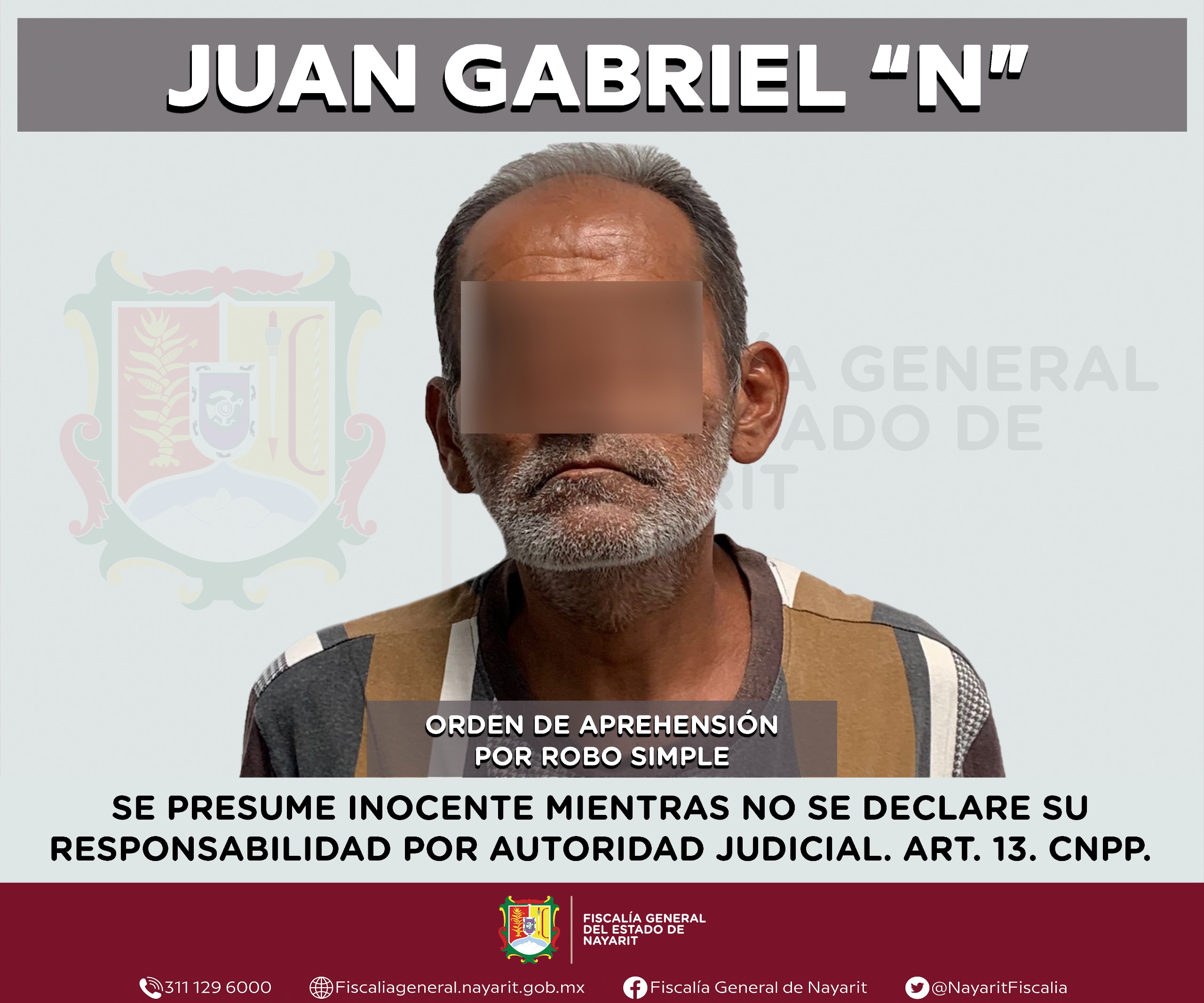La Fiscalía General del estado de Nayarit informa que elementos de la Agencia de Investigación Criminal ejecutaron una orden de aprehensión en la ciudad de Tepic contra Juan Gabriel “N”, por su probable participación en hechos que la ley tipifica como delito de robo simple, cometido en agravio de una mujer cuya identidad se reserva para proteger su derecho a la privacidad e integridad.