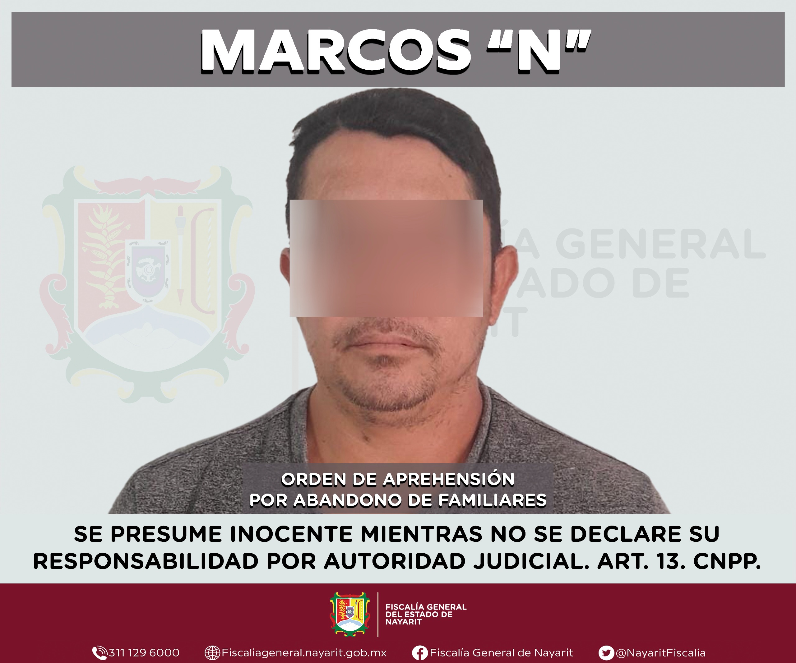 La Fiscalía General del estado de Nayarit informa que elementos de la Agencia de Investigación Criminal ejecutaron una orden de aprehensión en la ciudad de Tepic contra Marcos “N”, por su probable participación en hechos que la ley tipifica como delito de abandono de familiares, cometido en agravio de dos menores de edad cuyas identidades se reservan para proteger su derecho a la privacidad e integridad.