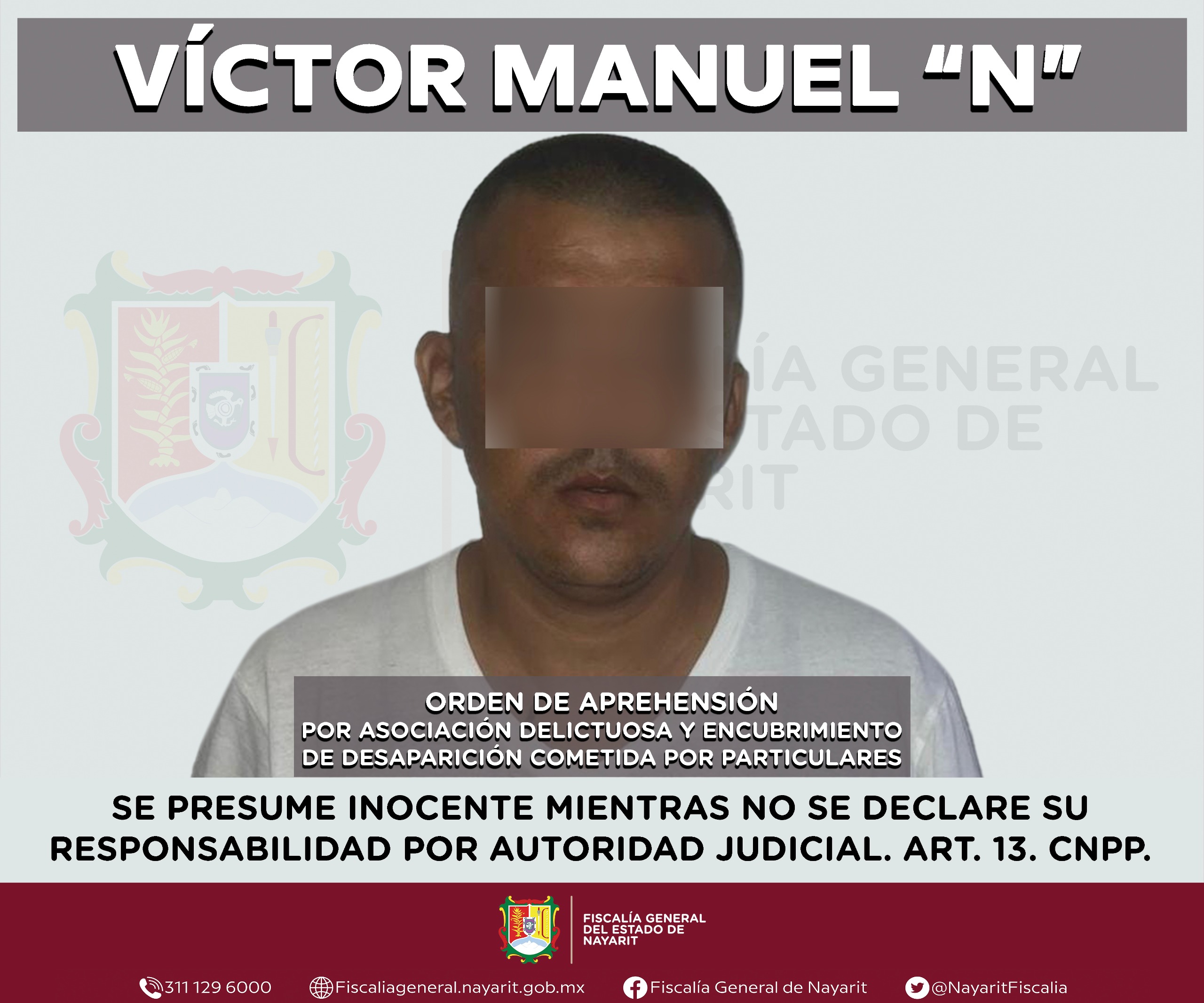 La Fiscalía General del estado de Nayarit informa que elementos de la Agencia de Investigación Criminal ejecutaron una orden de aprehensión en la ciudad de Tepic contra Víctor Manuel “N”, por su probable participación en hechos que la ley tipifica como delitos de asociación delictuosa y encubrimiento de desaparición cometida por particulares, en agravio de la sociedad y de una persona de sexo masculino cuya identidad se reserva.