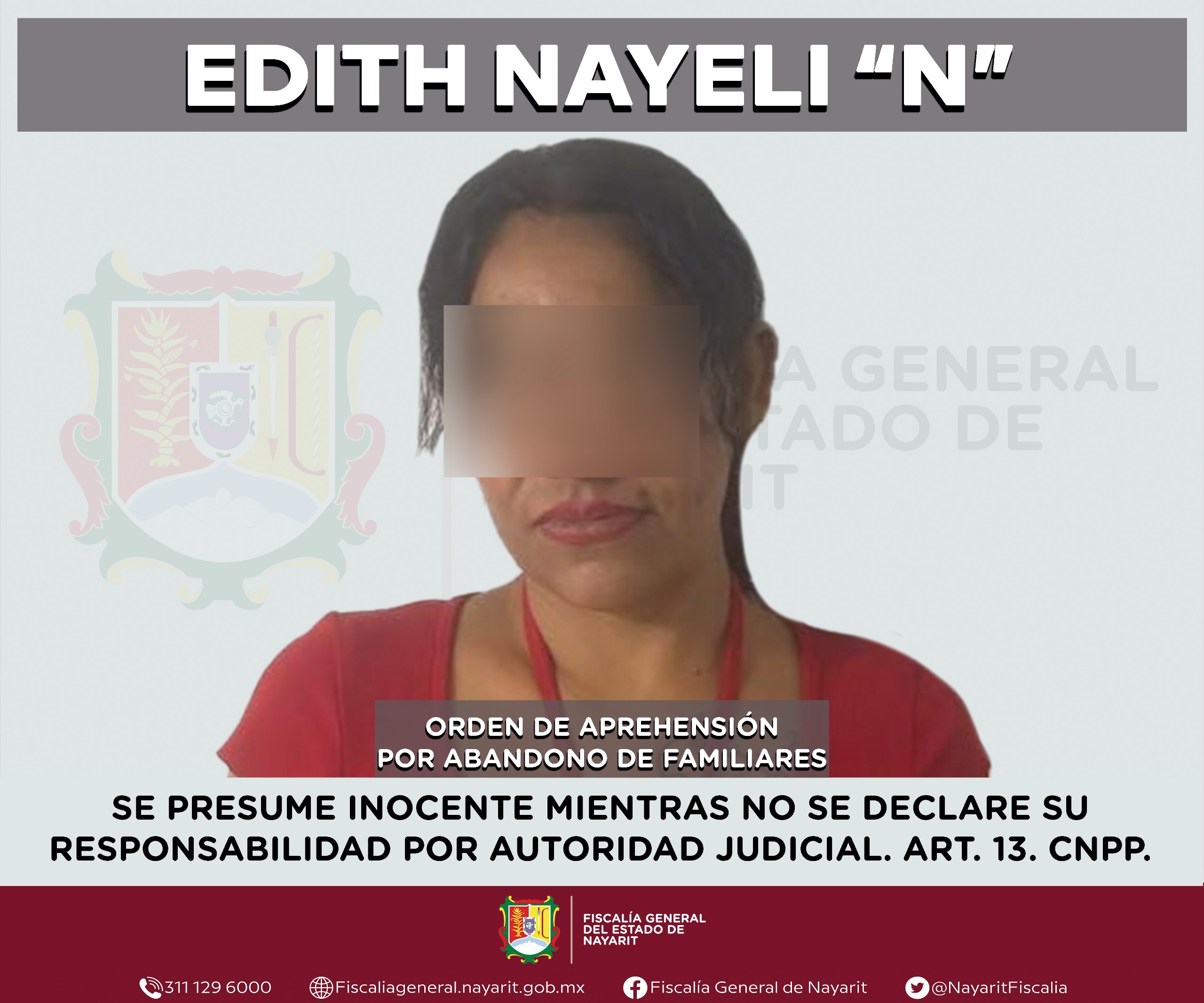 Elementos de la Agencia de Investigación Criminal cumplimentaron una orden de aprehensión en la capital nayarita contra Edith Nayeli “N”, por su probable participación en hechos que la legislación vigente tipifica como delito de abandono de familiares, en agravio de dos menores de edad cuyas identidades se reservan para proteger su derecho a la privacidad e integridad.