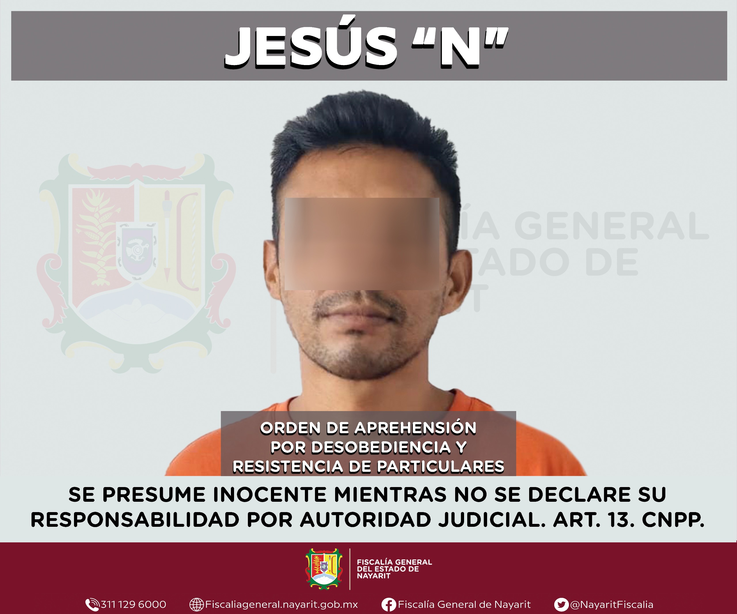 La Fiscalía General del estado de Nayarit informa que elementos de la Agencia de Investigación Criminal cumplimentaron una orden de aprehensión en contra de Jesús “N”, por su probable participación en hechos que la ley califica como delito de desobediencia y resistencia de particulares, cometido en agravio de la sociedad.