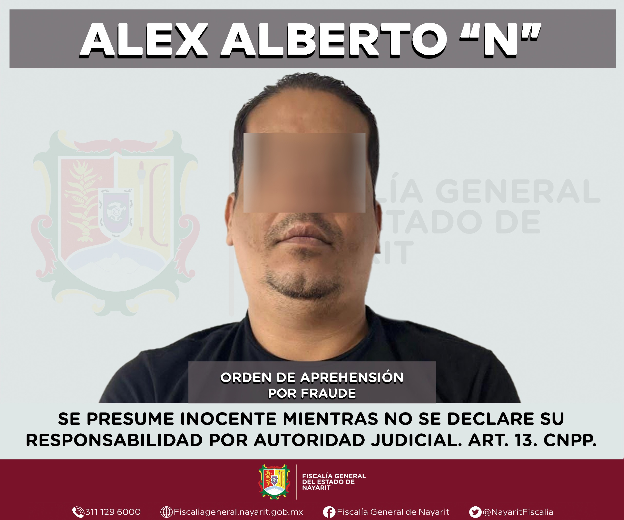 La Fiscalía General del estado de Nayarit informa que elementos de la Agencia de Investigación Criminal ejecutaron una orden de aprehensión en la capital nayarita contra Alex Alberto “N”, por su probable participación en hechos que la ley tipifica como delito de fraude, en agravio de una persona de sexo masculino cuya identidad se reserva en atención a su derecho a la privacidad e integridad.