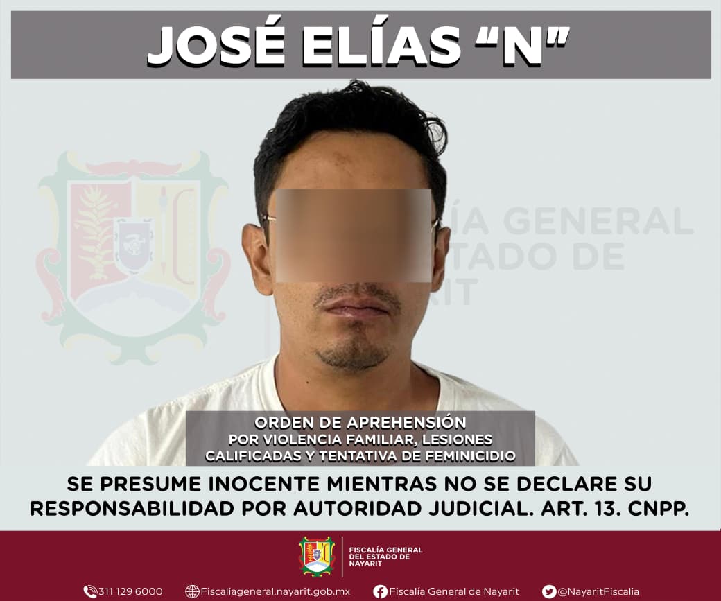 La Fiscalía General del estado de Nayarit informa que elementos de la Agencia de Investigación Criminal ejecutaron una orden de aprehensión en la capital nayarita contra José Elías “N”, por su probable participación en hechos que la ley tipifica como delitos de violencia familiar, lesiones calificadas y feminicidio agravado en grado de tentativa, en contra de una persona de sexo femenino cuya identidad se reserva en atención a su derecho a la privacidad e integridad.