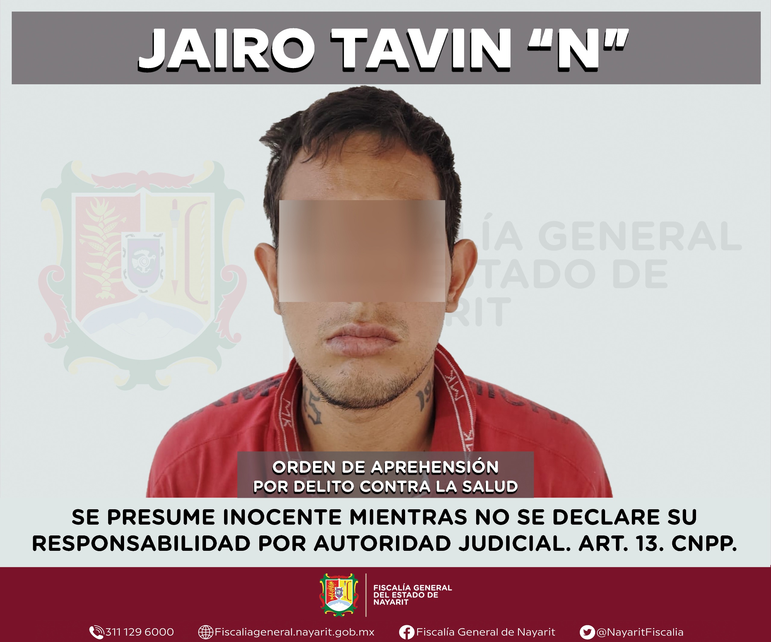 La Fiscalía General del estado de Nayarit informa que elementos de la Agencia de Investigación Criminal ejecutaron una orden de aprehensión contra Jairo Tavin “N”, por su probable participación en hechos que la legislación vigente tipifica como delito contra la salud en su modalidad de narcomenudeo -en su hipótesis de posesión de psicotrópicos-, cometido en agravio de la sociedad.