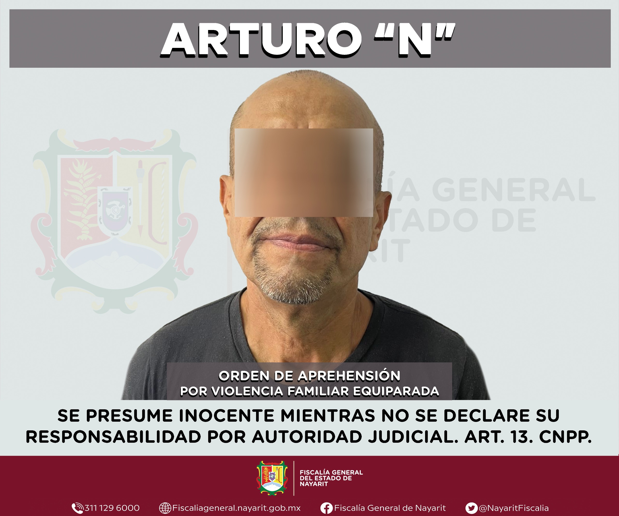 La Fiscalía General del estado de Nayarit informa que elementos de la Agencia de Investigación Criminal ejecutaron una orden de aprehensión contra Arturo “N”, por su probable participación en hechos que la legislación vigente tipifica como delito de violencia familiar equiparada, cometido en agravio de una persona de sexo femenino cuya identidad se reserva en atención a su derecho a la privacidad e integridad.