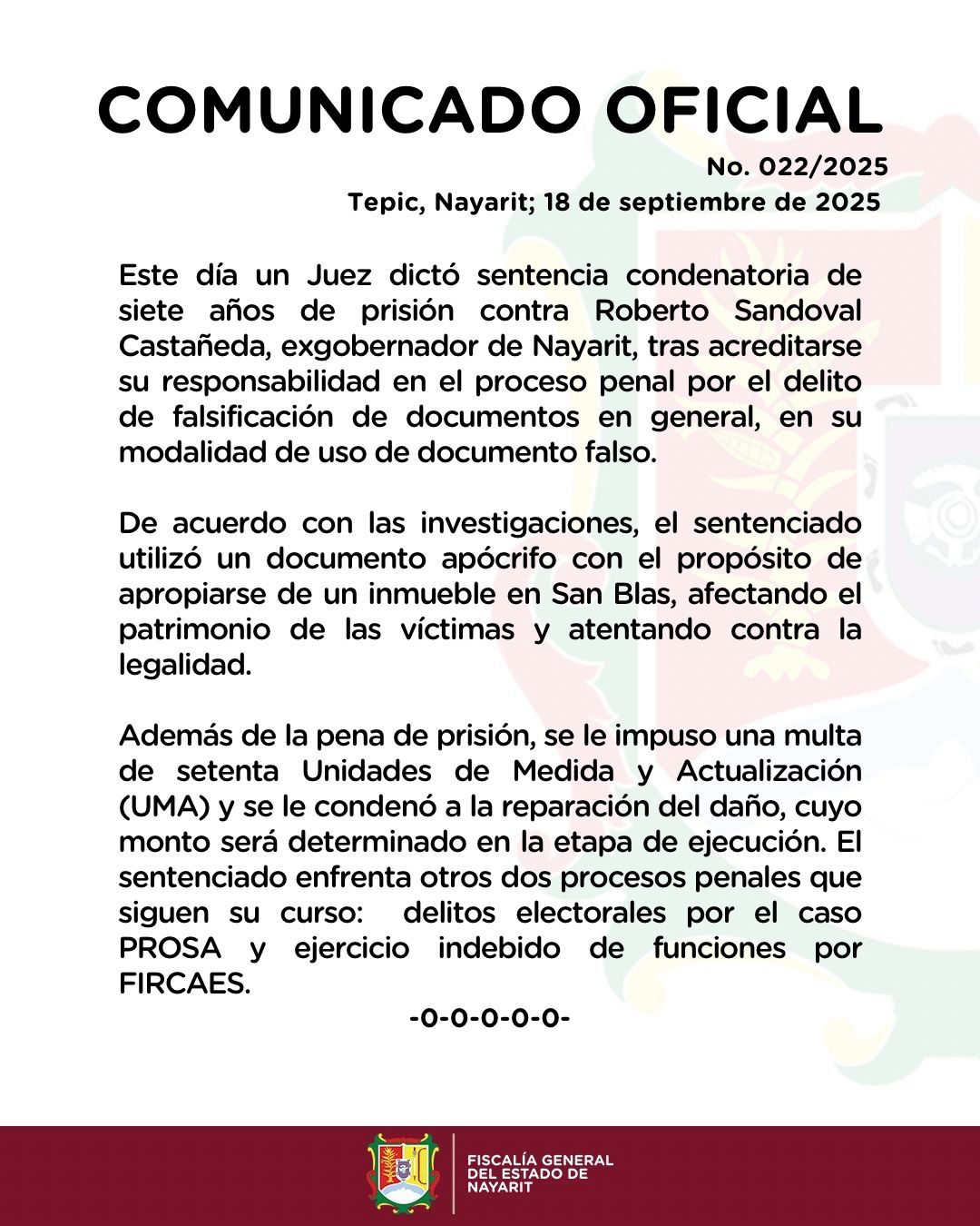 FGEN SENTENCIAN A EXGOBERNADOR DE NAYARIT ByPancho Sandoval Published 18 septiembre, 2025 Es de precisar que siguen su curso dos procesos penales: delitos electorales por el caso PROSA y ejercicio indebido de funciones por FIRCAES. In this article: Share Tweet Ver Más