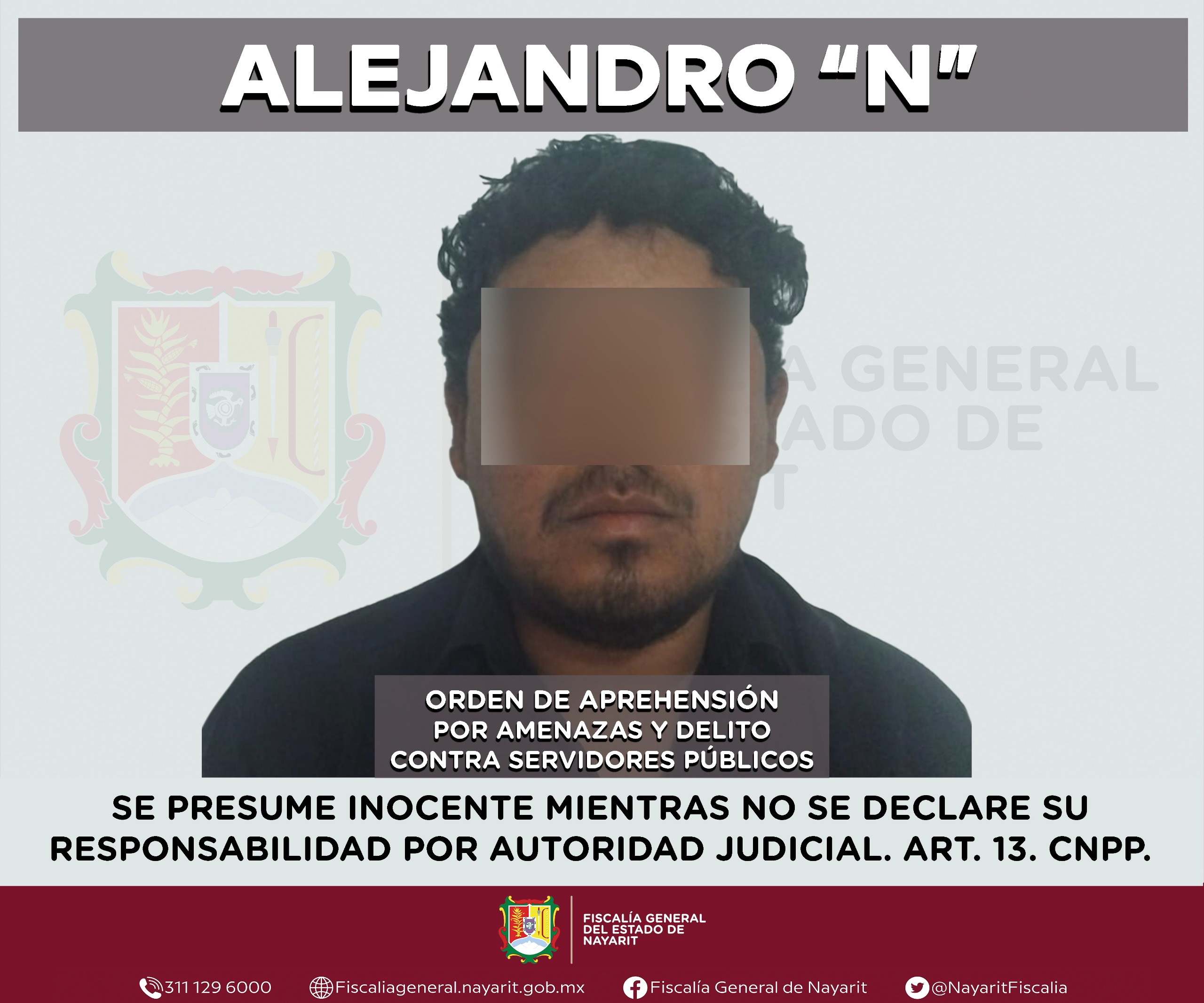 La Fiscalía General del estado de Nayarit informa que elementos de la Agencia de Investigación Criminal ejecutaron una orden de aprehensión en el municipio de Acaponeta contra Alejandro “N”, por su probable participación en hechos que la legislación vigente tipifica como delitos de amenazas y delito contra servidores públicos, cometido en agravio de una persona de sexo femenino cuya identidad se reserva en atención a su derecho a la privacidad e integridad.