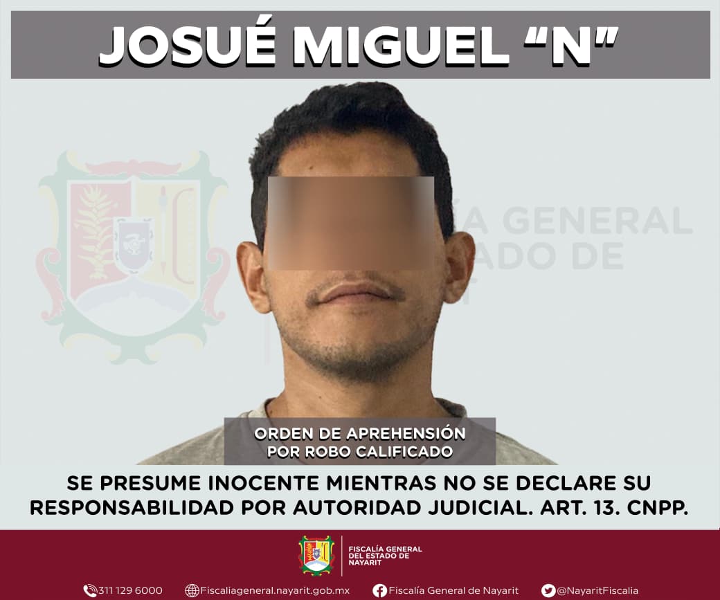 La Fiscalía General del estado de Nayarit informa que elementos de la Agencia de Investigación Criminal ejecutaron una orden de aprehensión contra Josué Miguel “N”, por su probable participación en hechos que la ley tipifica como delito de robo calificado, cometido en menoscabo de una persona de sexo masculino cuya identidad es de carácter reservado para proteger su derecho a la privacidad e integridad.