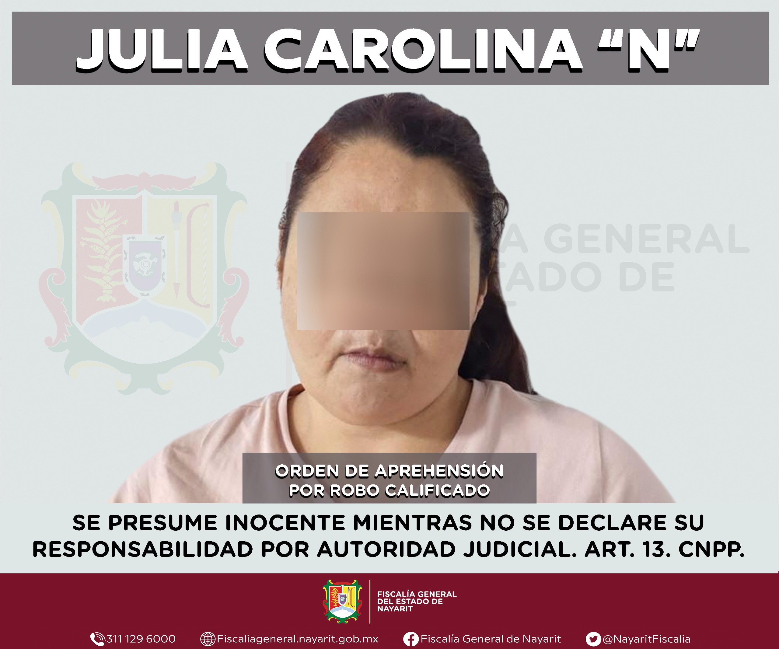 Elementos de la Agencia de Investigación Criminal de Nayarit ejecutaron una orden de aprehensión en la capital nayarita contra Julia Carolina “N”, por su presunta participación en hechos que según apreciación de la ley encuadran el delito de robo calificado, cometido en agravio de tienda comercial Casa Ley, S. A. P. I. de C. V.