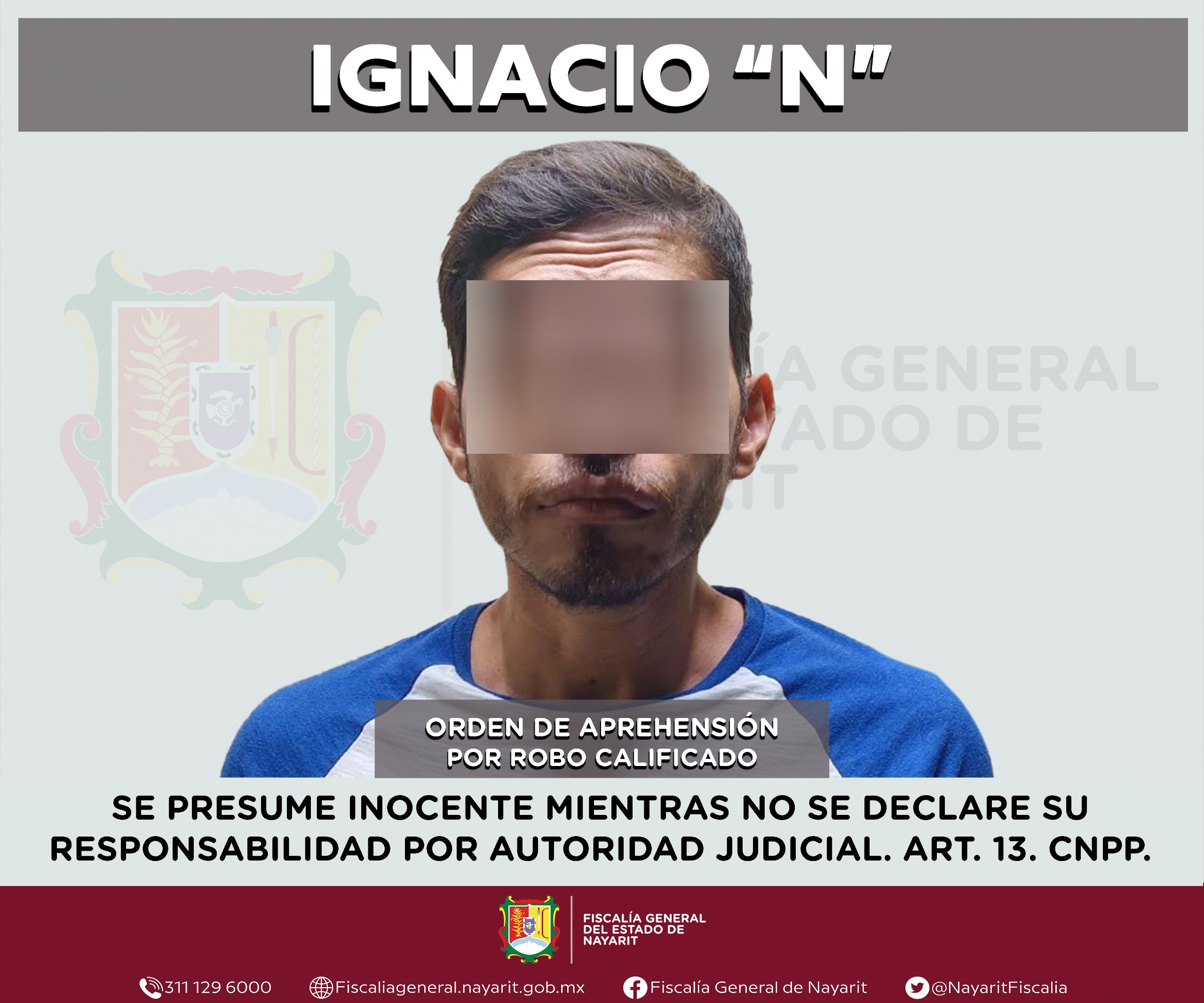La Fiscalía General del estado de Nayarit informa que elementos de la Agencia de Investigación Criminal ejecutaron una orden de aprehensión en la capital nayarita contra Ignacio “N”, por su probable participación en hechos que la ley tipifica como delito de robo calificado, cometido en perjuicio de Tienda Coppel, S. A. de C. V.