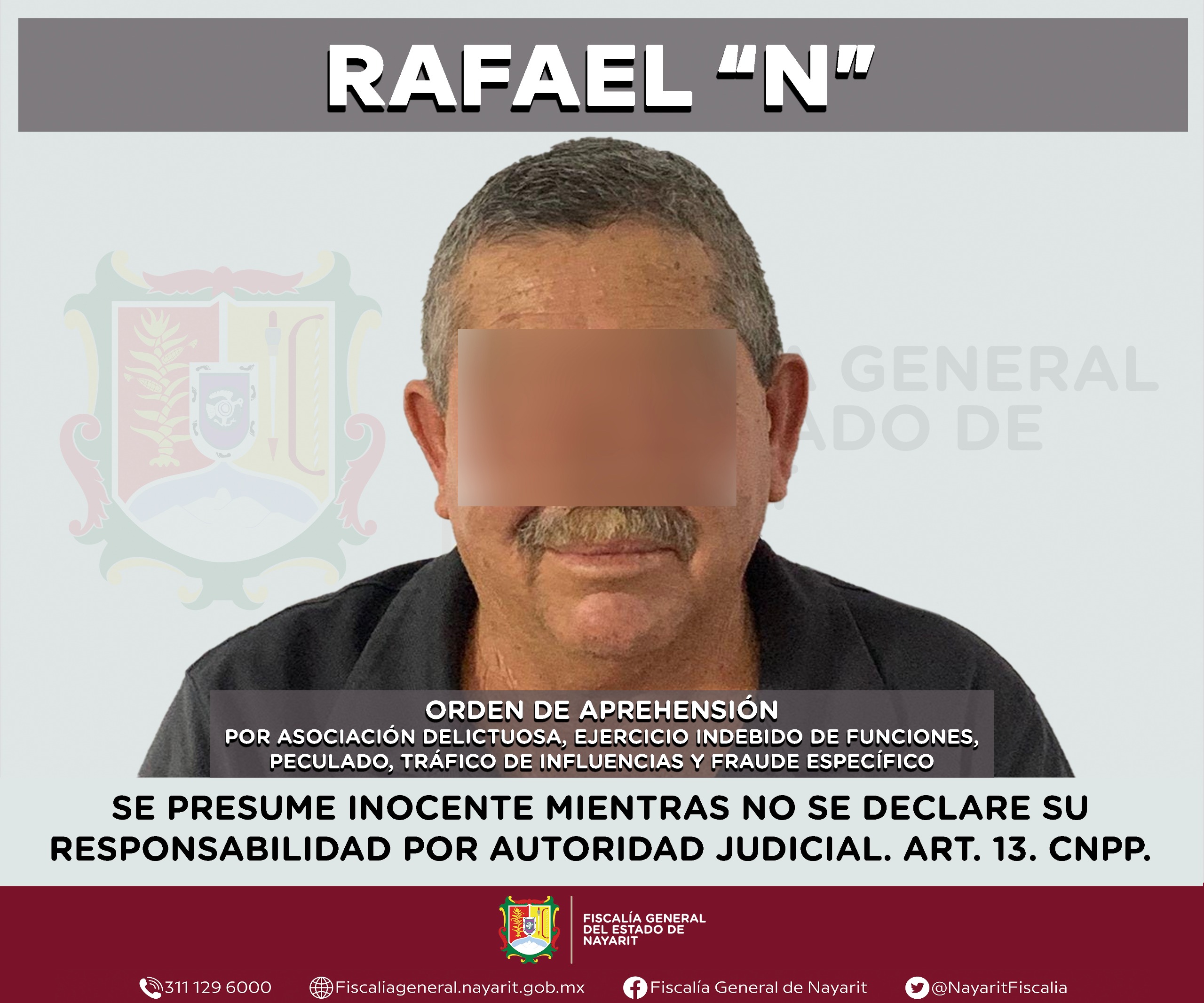 La Fiscalía General del estado de Nayarit informa que elementos de la Agencia de Investigación Criminal ejecutaron una orden de aprehensión en la ciudad de Tepic contra Rafael “N”, por su probable participación en hechos que la ley tipifica como delitos de asociación delictuosa, ejercicio indebido de funciones, peculado, tráfico de influencias y fraude específico, cometidos contra el Ayuntamiento Constitucional de Ahuacatlán y de la sociedad.