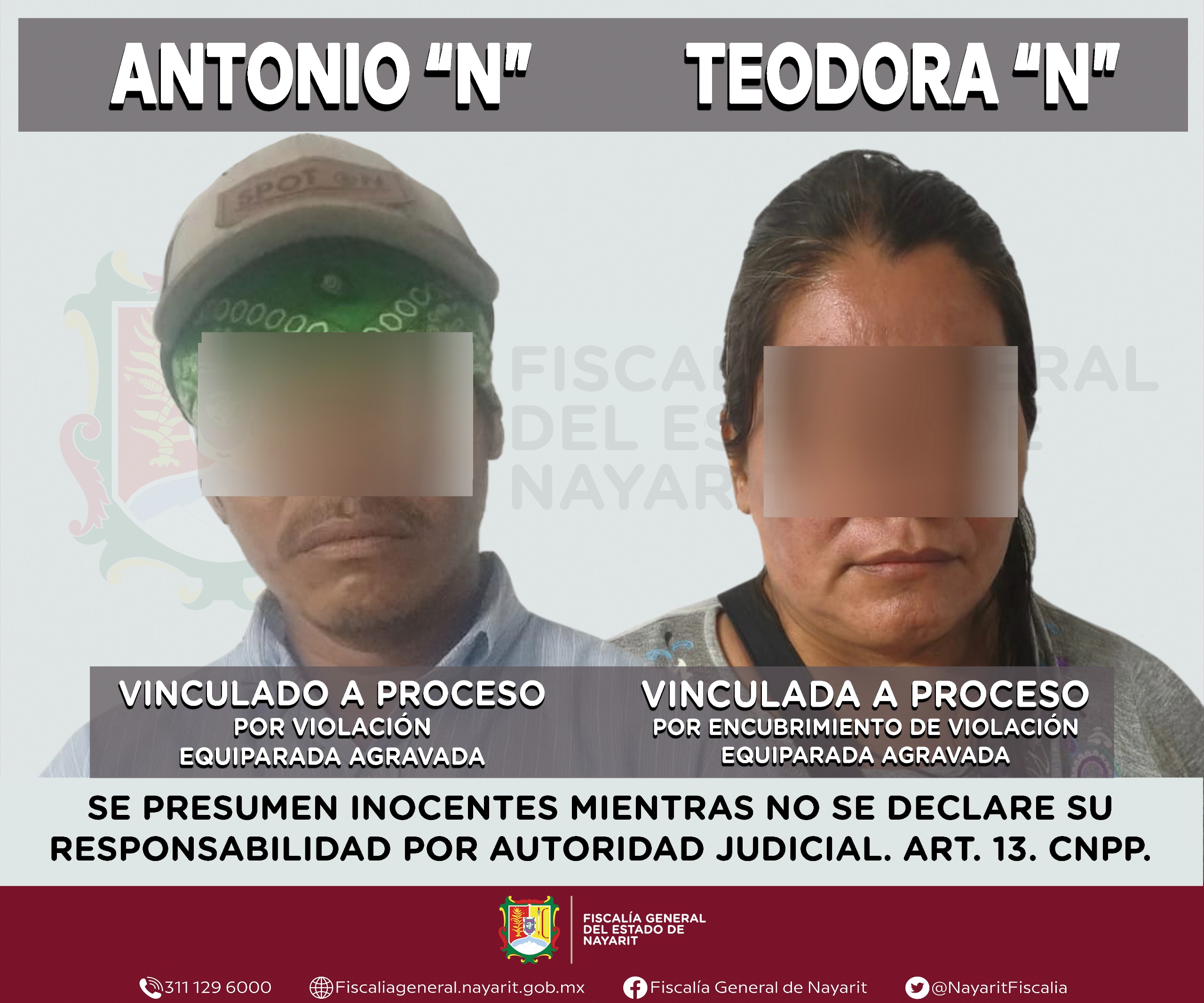Tepic, Nayarit; 26 de septiembre de 2025. – La Fiscalía General del estado de Nayarit informa que un Juez de Control dictó auto de vinculación a proceso contra Antonio “N”, por su probable participación en el delito de violación equiparada agravada, así como contra Teodora “N”, por su presunta responsabilidad en el delito de encubrimiento de violación equiparada agravada, en agravio de una adolescente cuya identidad se mantiene bajo reserva para proteger sus derechos.