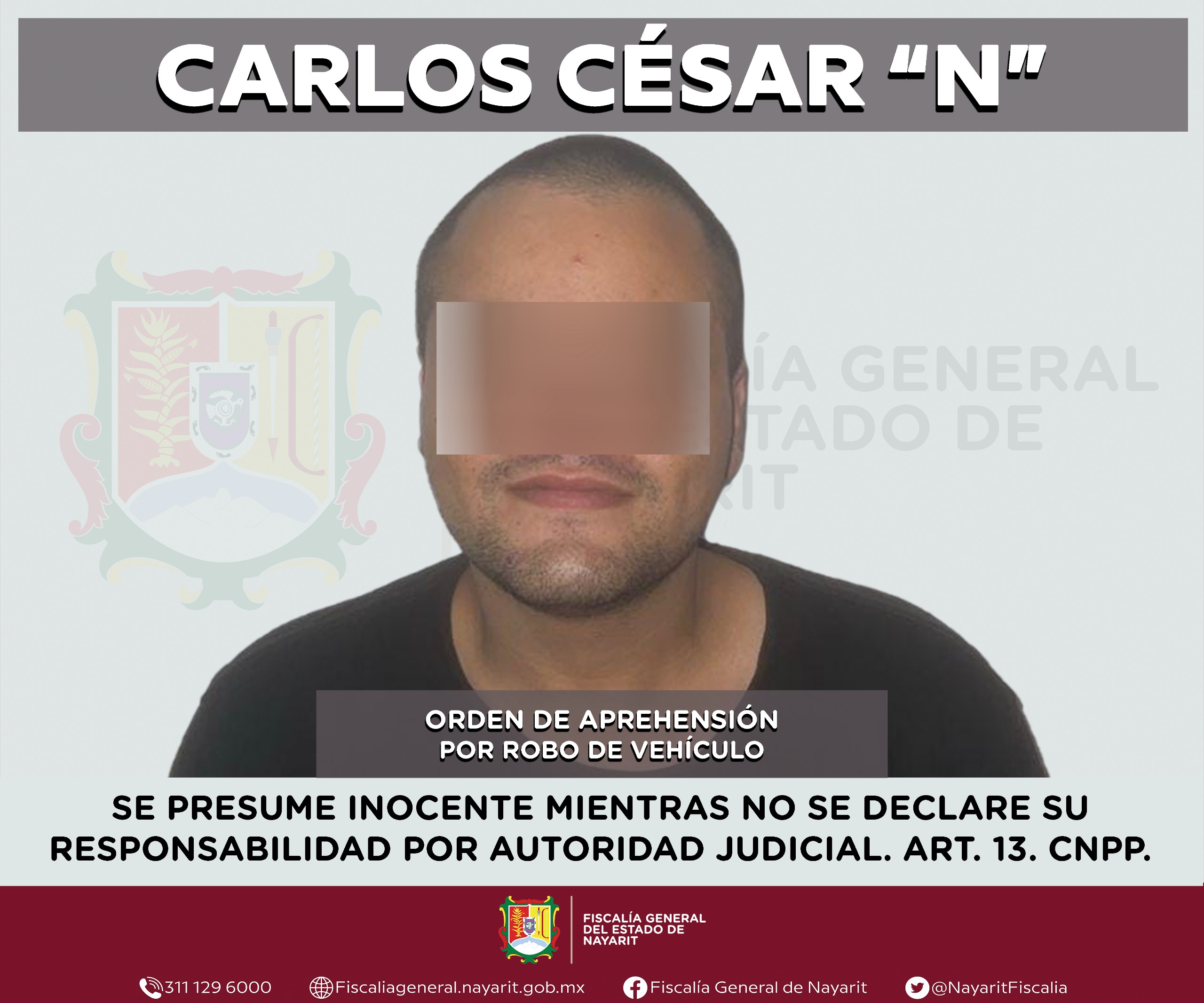 La Fiscalía General del estado de Nayarit informa que elementos de la Agencia de Investigación Criminal ejecutaron una orden de aprehensión en la ciudad de Tepic contra Carlos César “N”, por su probable participación en hechos que la ley tipifica como delito de robo calificado -vehículo-, cometido en perjuicio de una persona de sexo masculino de quien por respeto a su derecho a la privacidad e integridad se reserva la identidad.