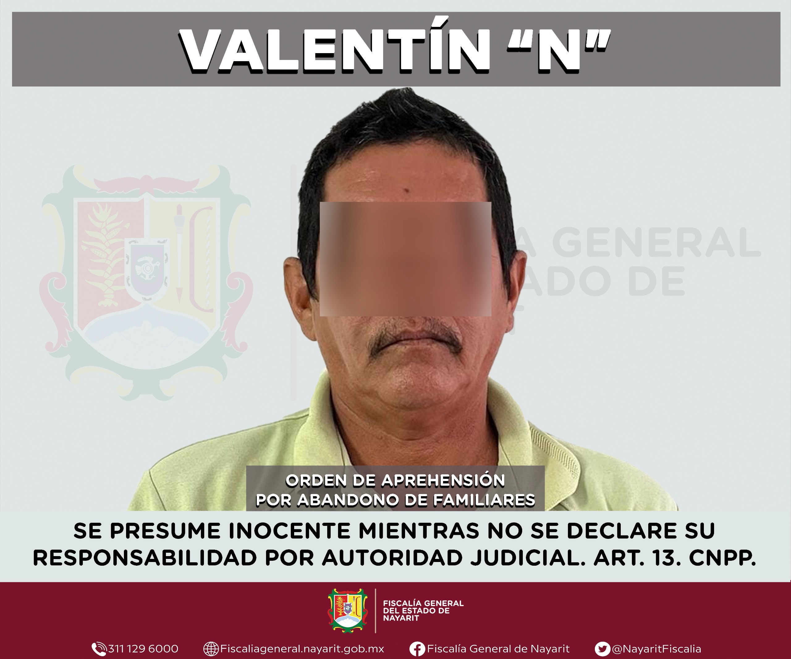 Elementos de la Agencia de Investigación Criminal de Nayarit cumplimentaron una orden de aprehensión en la ciudad de Tepic contra Valentín “N”, por su probable participación en hechos que la legislación vigente tipifica como delito de abandono de familiares, siendo la víctima un menor de edad cuya identidad se mantiene bajo reserva por respeto a su derecho a la privacidad e integridad.