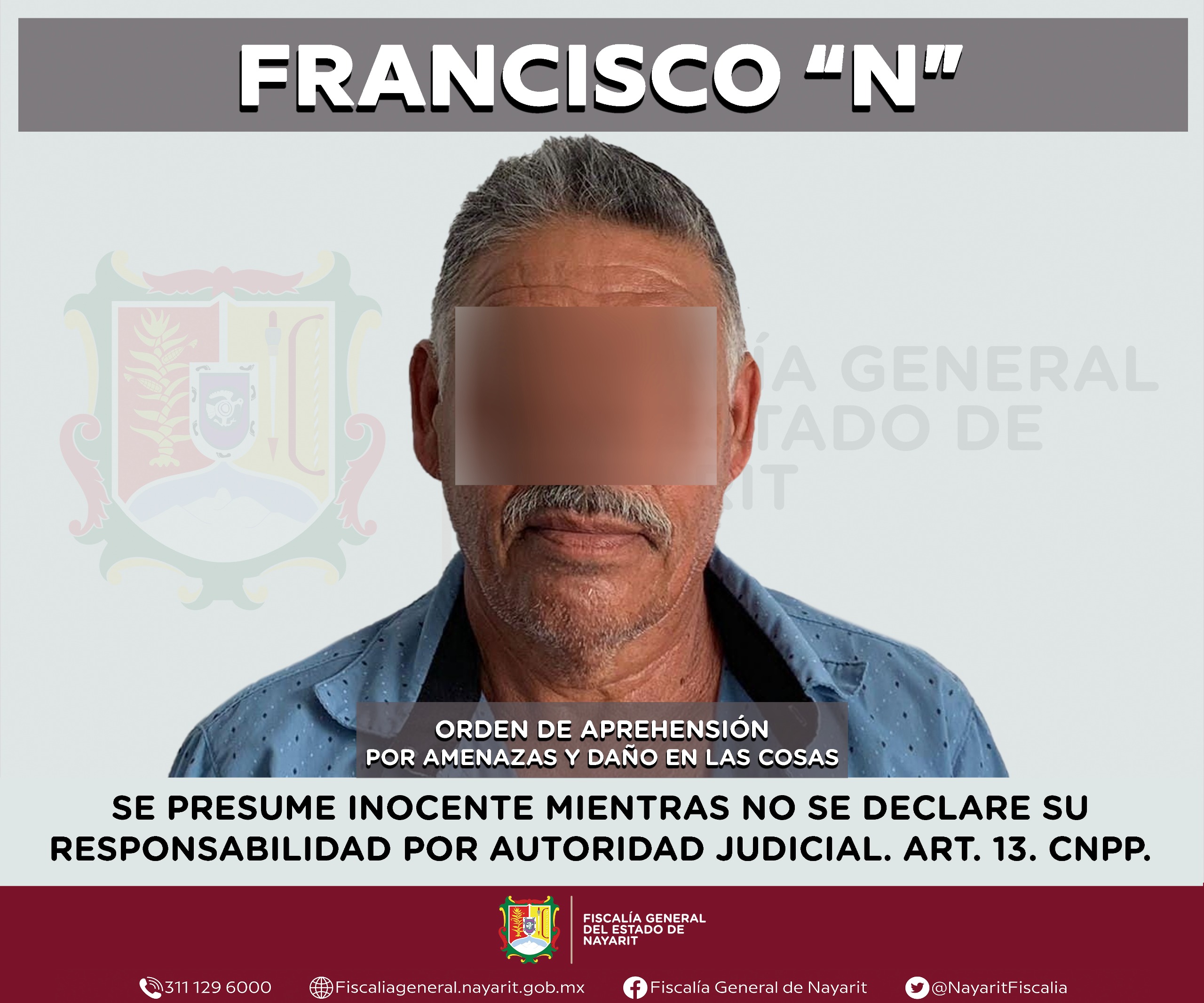 La Fiscalía General del estado de Nayarit informa que elementos de la Agencia de Investigación Criminal ejecutaron una orden de aprehensión en la capital nayarita contra Francisco “N”, por su probable participación en hechos que la ley tipifica como delitos de amenazas y daño en las cosas, en agravio de una persona de sexo masculino cuya identidad se reserva por respeto a su derecho a la privacidad e integridad.