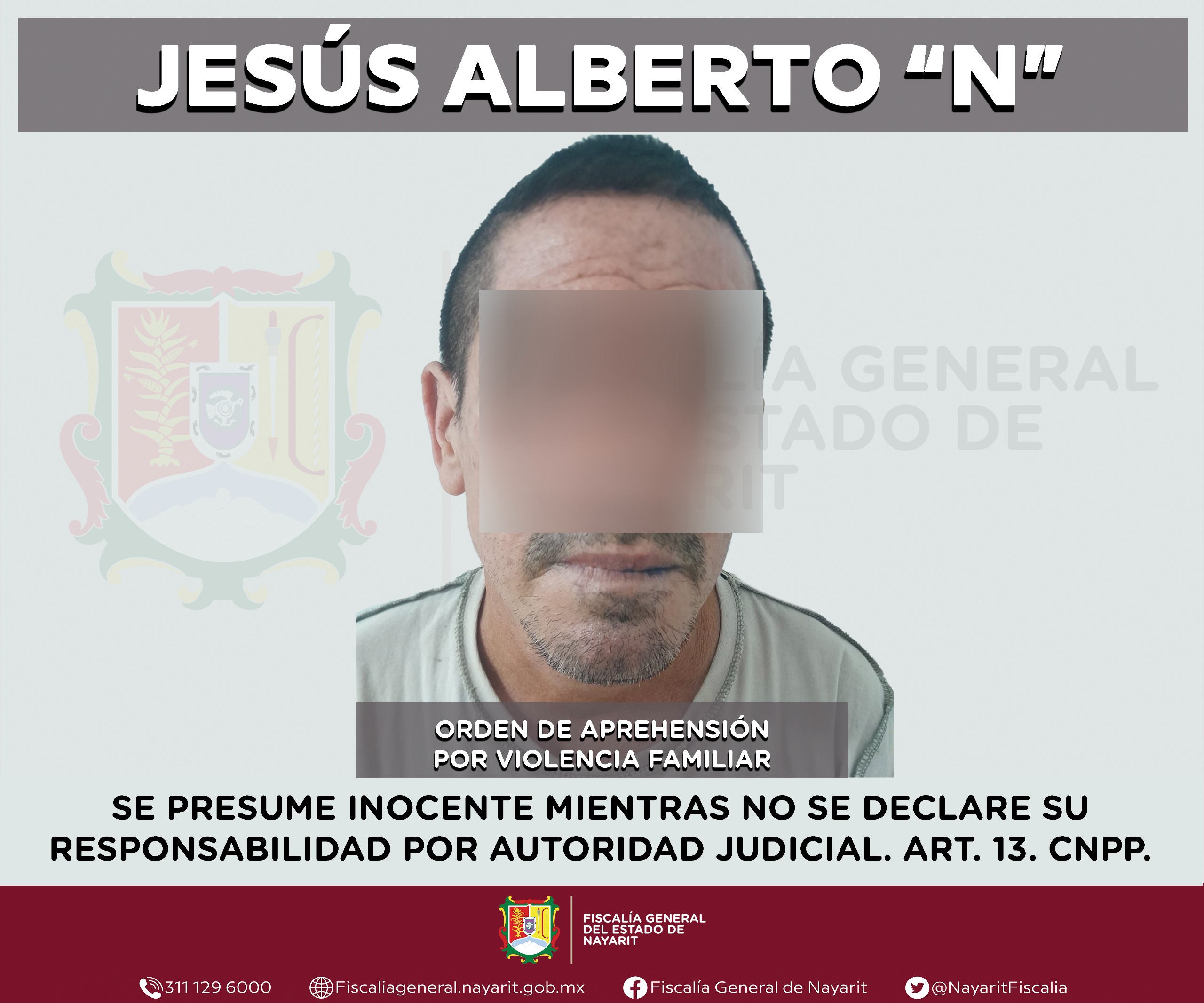 La Fiscalía General del estado de Nayarit informa que elementos de la Agencia de Investigación Criminal ejecutaron una orden de aprehensión en la localidad Las Varas, municipio de Compostela contra Jesús Alberto “N”, por su probable participación en hechos que para la ley configuran el delito de violencia familiar, en agravio de una persona de sexo femenino de quien por respeto a su derecho a la privacidad e integridad se reserva la identidad.