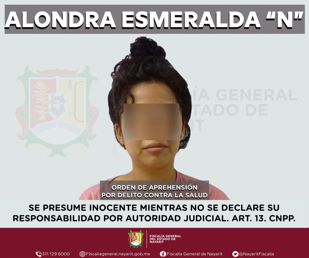 La Fiscalía General del estado de Nayarit informa que elementos de la Agencia de Investigación Criminal ejecutaron una orden de aprehensión en la ciudad de Tepic contra Alondra Esmeralda “N”, por su probable participación en hechos que la legislación vigente tipifica como delito contra la salud en su modalidad de narcomenudeo -en su hipótesis de posesión de psicotrópicos-, cometido en agravio de la sociedad.