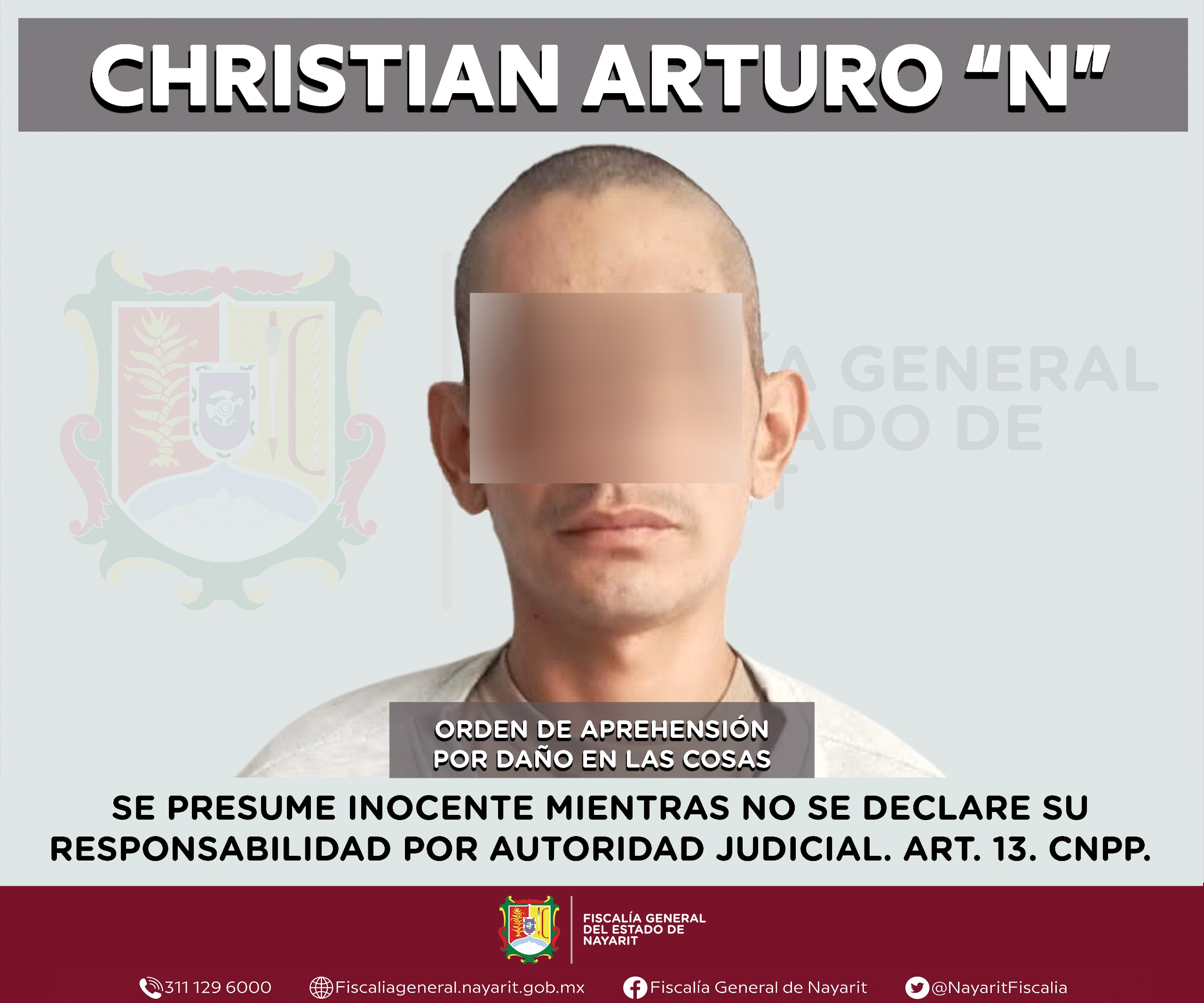 La Fiscalía General del estado de Nayarit informa que elementos de la Agencia de Investigación Criminal ejecutaron una orden de aprehensión en la ciudad de Tepic contra Christian Arturo “N”, por su probable participación en hechos que para la ley configuran el delito de daño en las cosas, cometido en agravio de una persona de sexo masculino cuya identidad se reserva por respeto a su derecho a la privacidad e integridad.