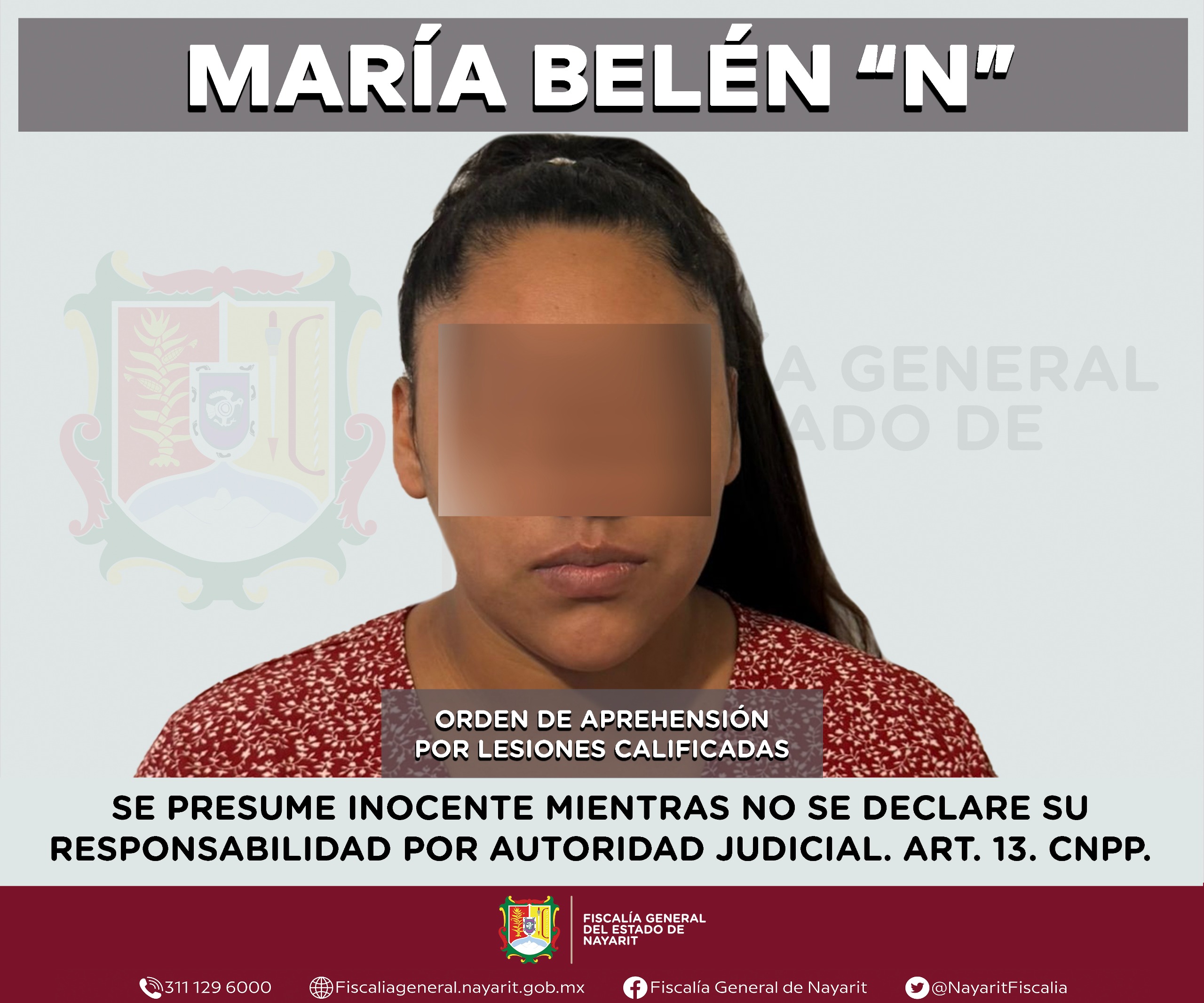 Elementos de la Agencia de Investigación Criminal de Nayarit cumplimentaron una orden de aprehensión contra María Belén “N”, por su probable participación en hechos que la legislación vigente tipifica como delito de lesiones calificadas, cometido en agravio de una persona de sexo femenino cuya identidad se reserva por respeto a su derecho a la privacidad e integridad.