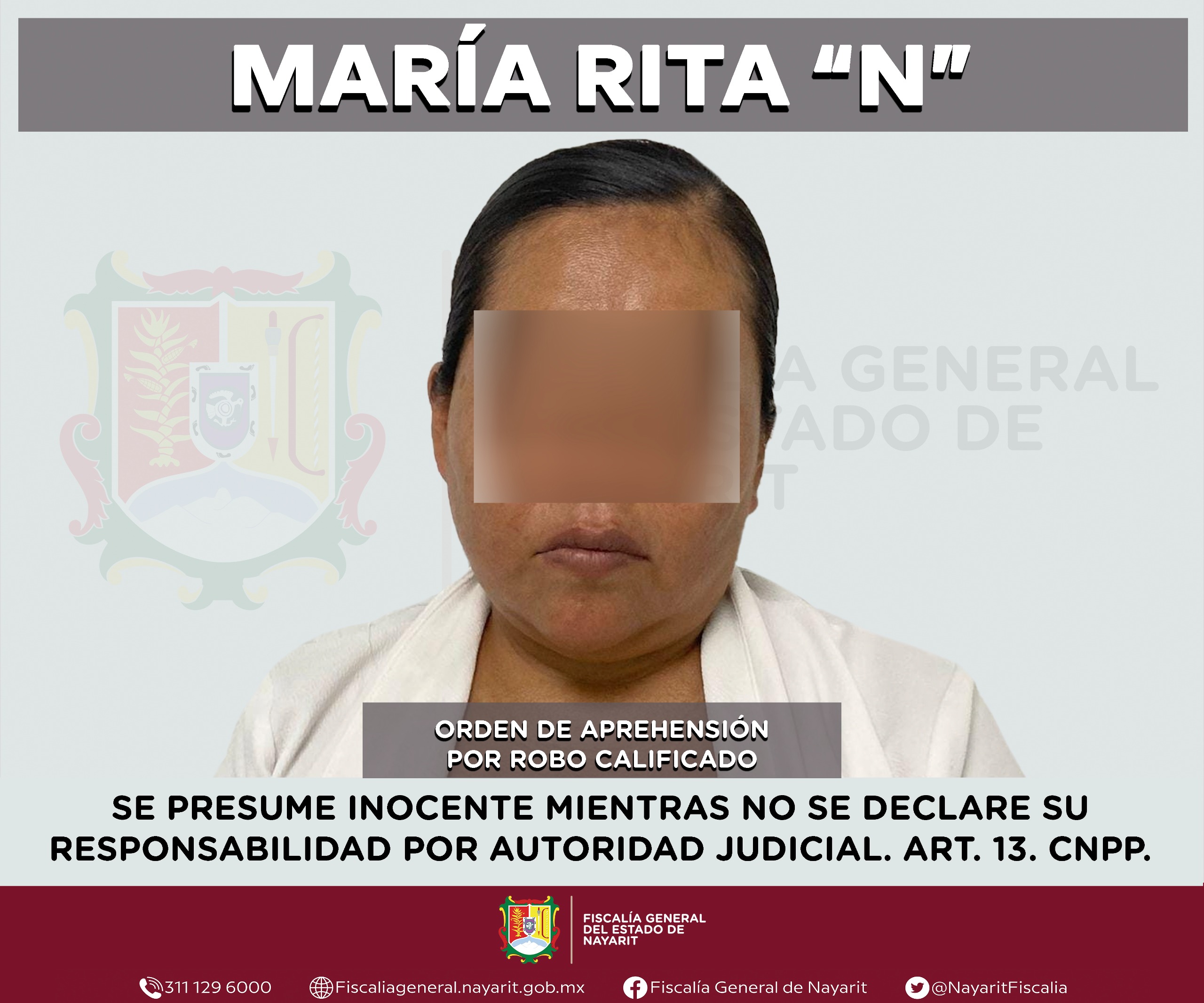 Elementos de la Agencia de Investigación Criminal de Nayarit cumplimentaron una orden de aprehensión en la ciudad de Tepic contra María Rita “N”, por su probable participación en hechos que la legislación vigente tipifica como delito de robo calificado, cometido en perjuicio de dos personas de sexo femenino de quienes se reservan sus identidades por respeto a su derecho a la privacidad e integridad.
