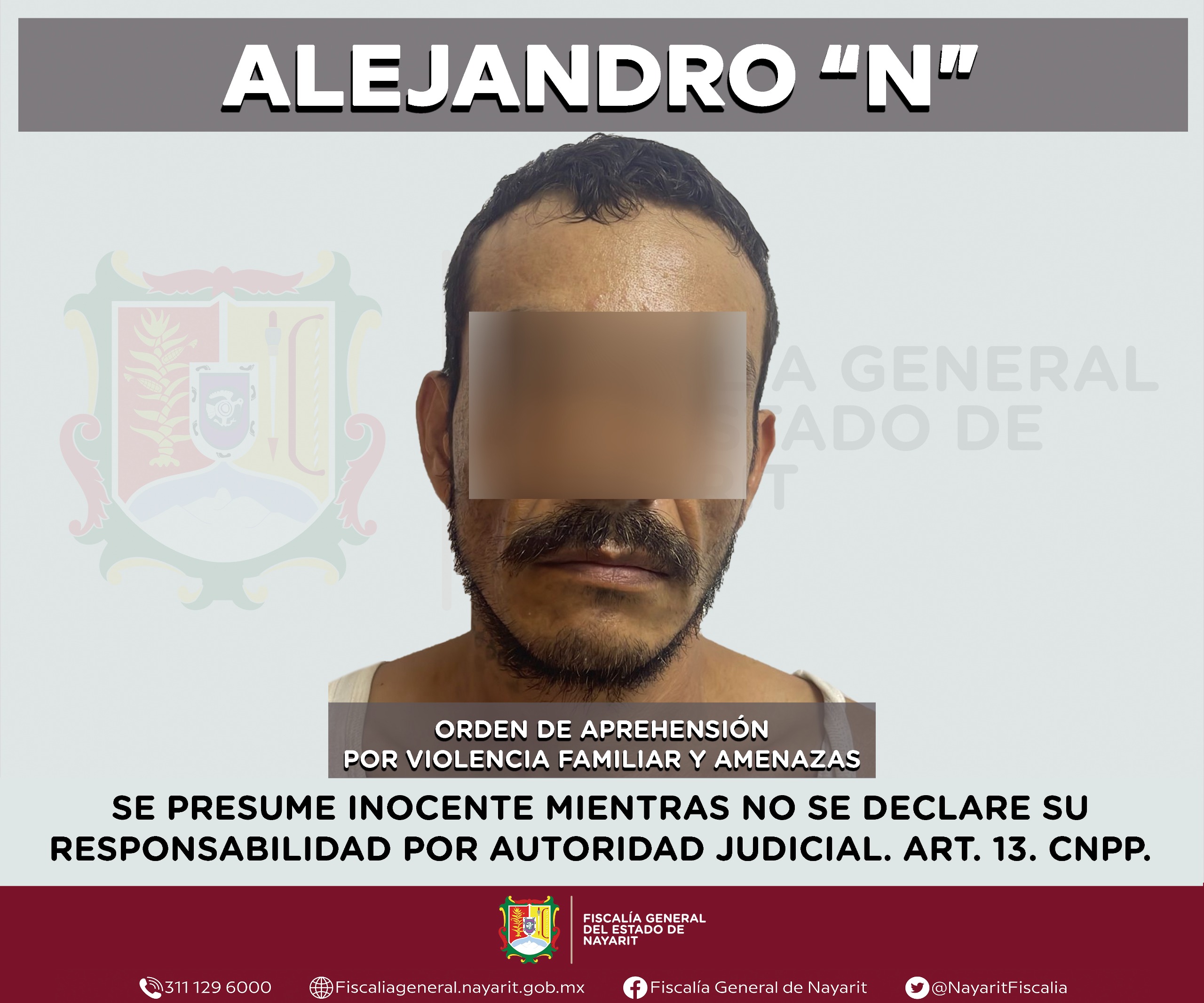 La Fiscalía General del estado de Nayarit informa que elementos de la Agencia de Investigación Criminal ejecutaron una orden de aprehensión en el municipio de Tuxpan contra Alejandro “N”, por su probable participación en hechos que para la ley configuran los delitos de violencia familiar y amenazas, cometidos en agravio de una persona de sexo masculino cuya identidad se reserva por respeto a su derecho a la privacidad e integridad.