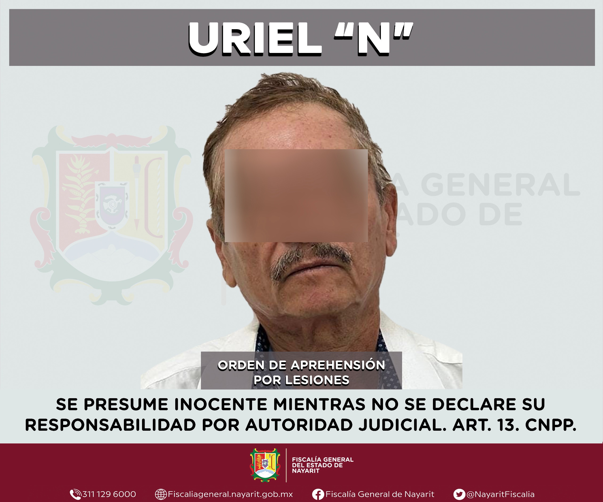 La Fiscalía General del estado de Nayarit informa que elementos de la Agencia de Investigación Criminal ejecutaron una orden de aprehensión en la localidad San Vicente, municipio de Bahía de Banderas contra Uriel “N”, por su probable participación en hechos que la legislación vigente tipifica como delito de lesiones.