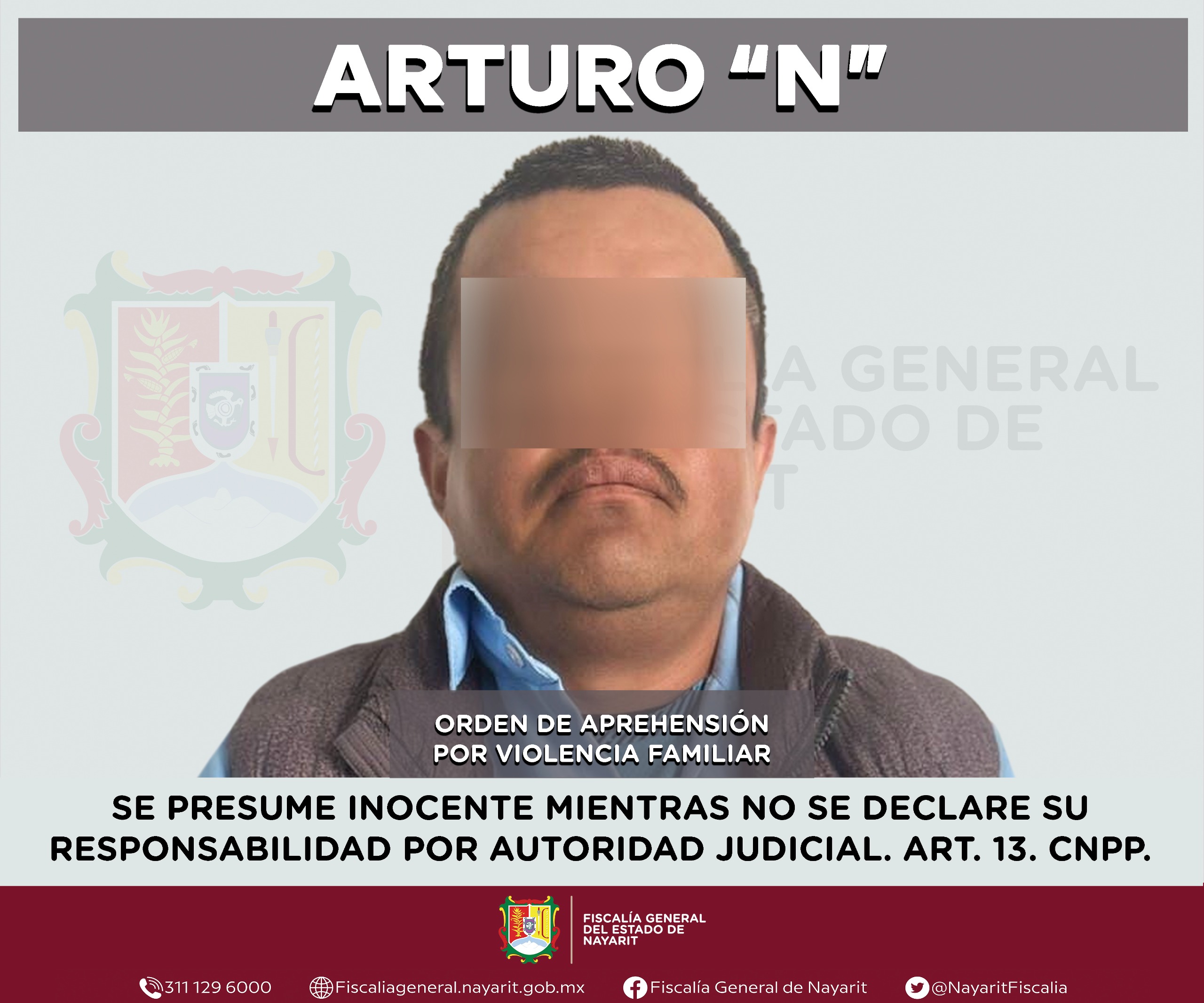 La Fiscalía General del estado de Nayarit informa que elementos de la Agencia de Investigación Criminal ejecutaron una orden de aprehensión en la ciudad de Tepic contra Arturo “N”, por su probable participación en hechos que la legislación vigente tipifica como delito de violencia familiar, cometido en agravio de una persona de sexo femenino cuya identidad se reserva por respeto a su derecho a la privacidad e integridad.