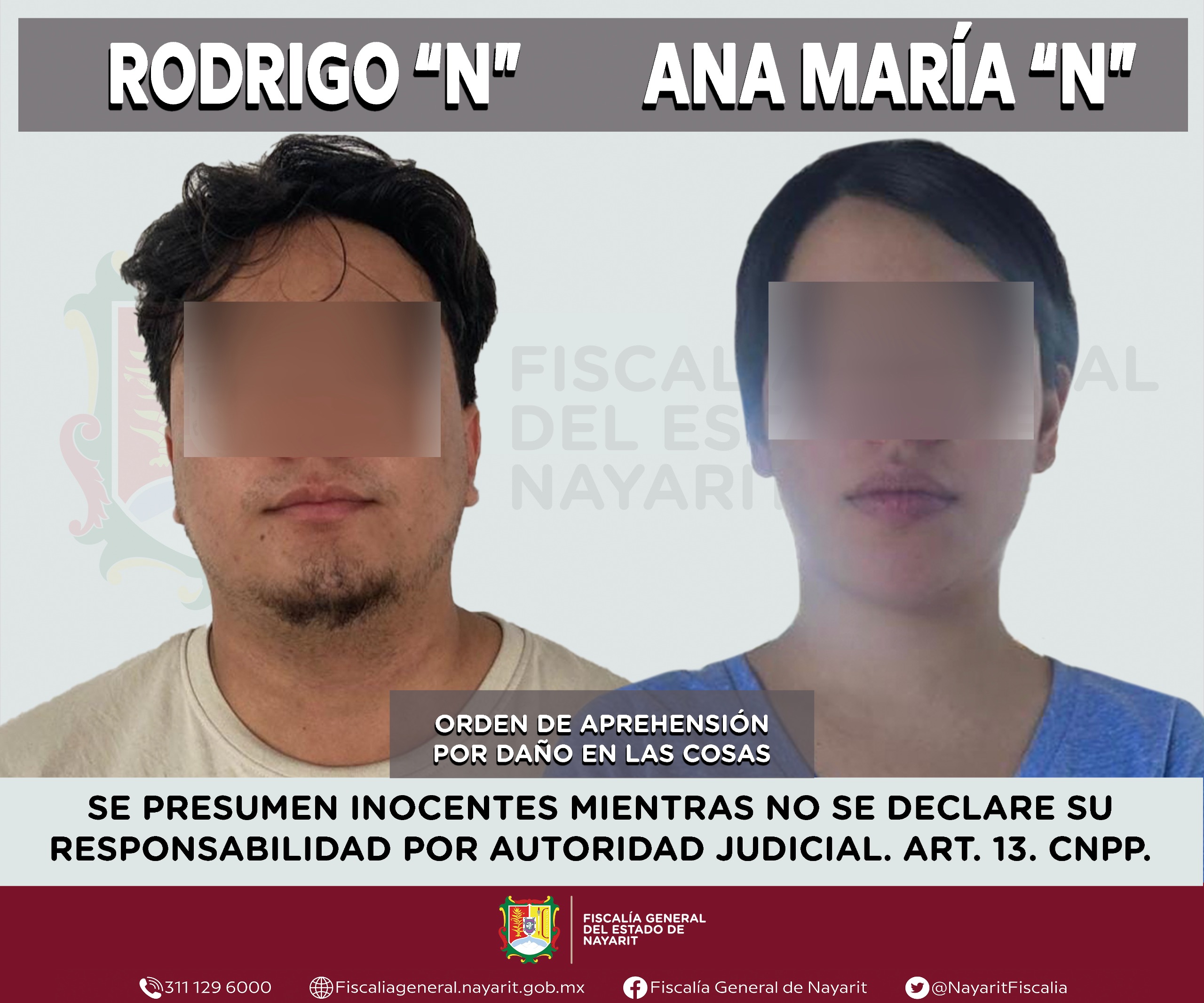 Elementos de la Agencia de Investigación Criminal de Nayarit ejecutaron una orden de aprehensión contra Rodrigo “N” y Ana María “N”, por su probable participación en hechos que la legislación vigente tipifica como delito de daño en las cosas, cometido el día 20 de octubre del presente año, en agravio de Gobierno del estado de Nayarit.