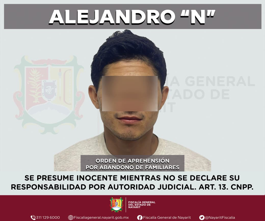 La Fiscalía General del estado de Nayarit informa que elementos de la Agencia de Investigación Criminal ejecutaron una orden de aprehensión en el municipio de Santiago Ixcuintla contra Alejandro “N”, por su probable participación en hechos que la ley tipifica como delito de abandono de familiares, cometido en agravio de un menor de edad cuya identidad se reserva en atención a su derecho a la privacidad e integridad.