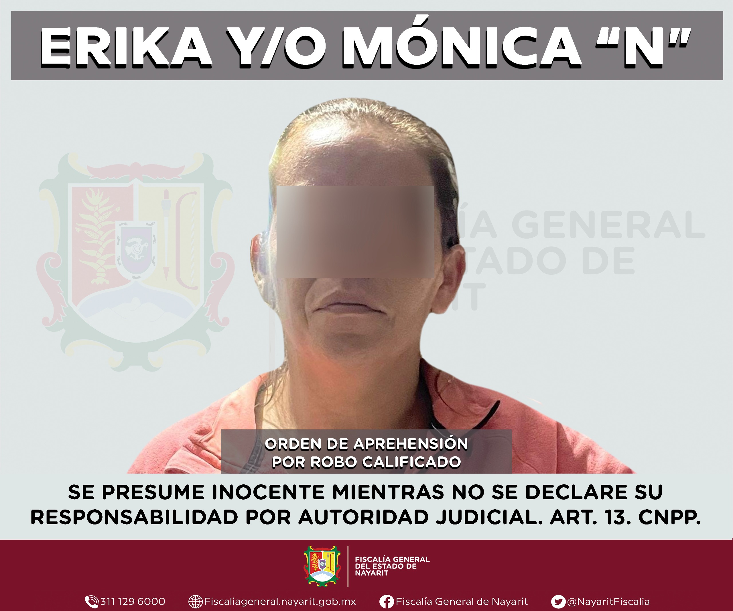 Elementos de la Agencia de Investigación Criminal de Nayarit ejecutaron una orden de aprehensión contra Erika y/o Mónica “N”, por su probable participación en hechos que la legislación vigente tipifica como delito de robo calificado, cometido en agravio de una persona de sexo femenino cuya identidad se reserva con el propósito de salvaguardar su privacidad e integridad.