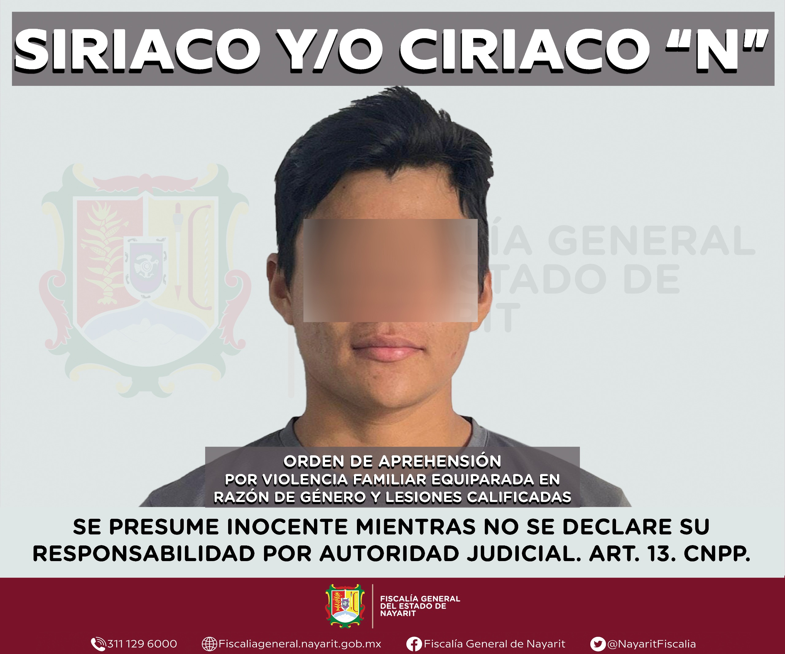 La Fiscalía General del estado de Nayarit informa que elementos de la Agencia de Investigación Criminal ejecutaron una orden de aprehensión contra Siriaco y/o Ciriaco “N”, por su probable participación en hechos que la ley tipifica como delitos de violencia familiar equiparada en razón de género y lesiones calificadas, cometidos en contra de una adolescente cuya identidad se reserva con el propósito de salvaguardar su privacidad e integridad.