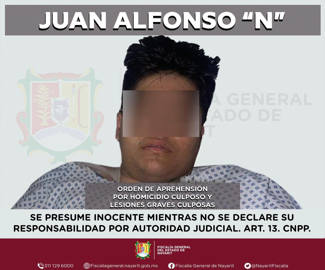 La Fiscalía General del estado de Nayarit informa que elementos de la Agencia de Investigación Criminal ejecutaron una orden de aprehensión contra Juan Alfonso “N”, por su probable participación en hechos que la ley tipifica como delitos de homicidio culposo y lesiones graves culposas, ocurridos el pasado 15 de noviembre del presente año en la autopista Compostela Bahía de Banderas.