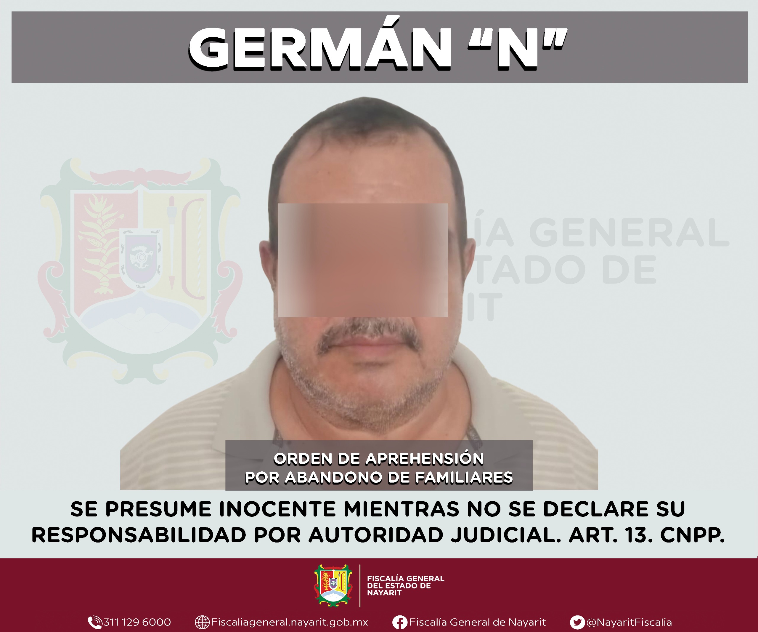 La Fiscalía General del estado de Nayarit informa que elementos de la Agencia de Investigación Criminal ejecutaron una orden de aprehensión en el municipio de Acaponeta contra Germán “N”, por su probable participación en hechos que la ley tipifica como delito de abandono de familiares, cometido contra un menor de edad cuya identidad se reserva con el propósito de salvaguardar su privacidad e integridad.