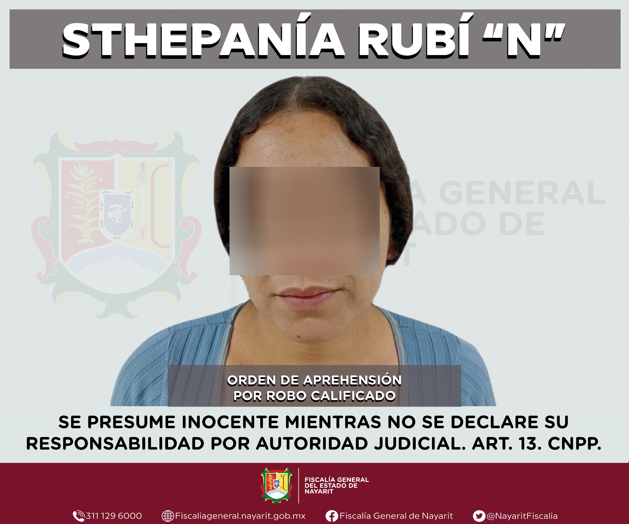 Elementos de la Agencia de Investigación Criminal de Nayarit ejecutaron una orden de aprehensión en la ciudad de Tepic contra Sthepanía Rubí “N”, por su probable participación en hechos que la legislación vigente tipifica como delito de robo calificado.