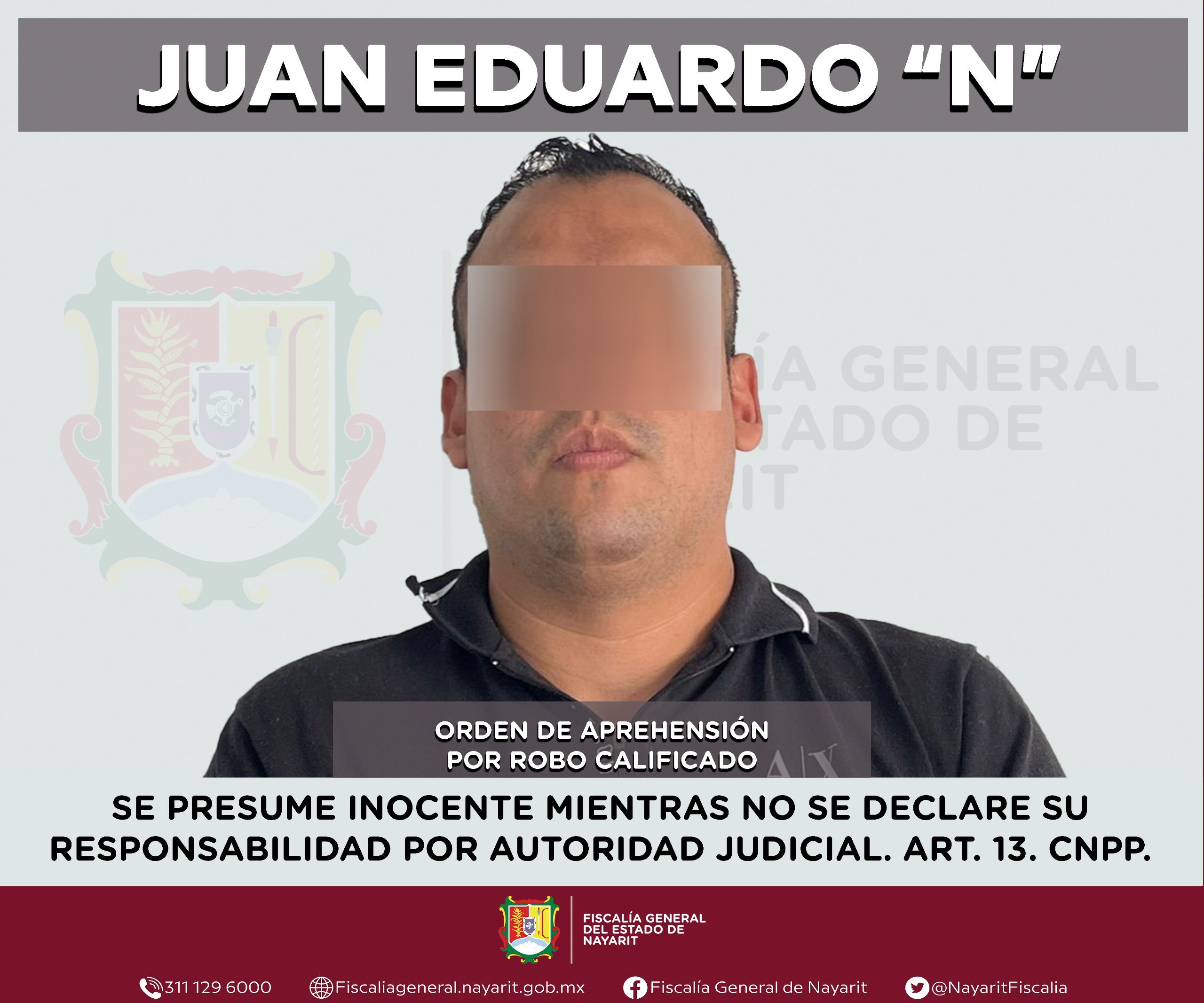 La Fiscalía General del Estado de Nayarit informa que elementos de la Agencia de Investigación Criminal cumplimentaron una orden de aprehensión contra Juan Eduardo “N”, por su probable participación en hechos constitutivos del delito de robo calificado, cometido en agravio de una mujer cuya identidad se reserva para proteger su privacidad e integridad.