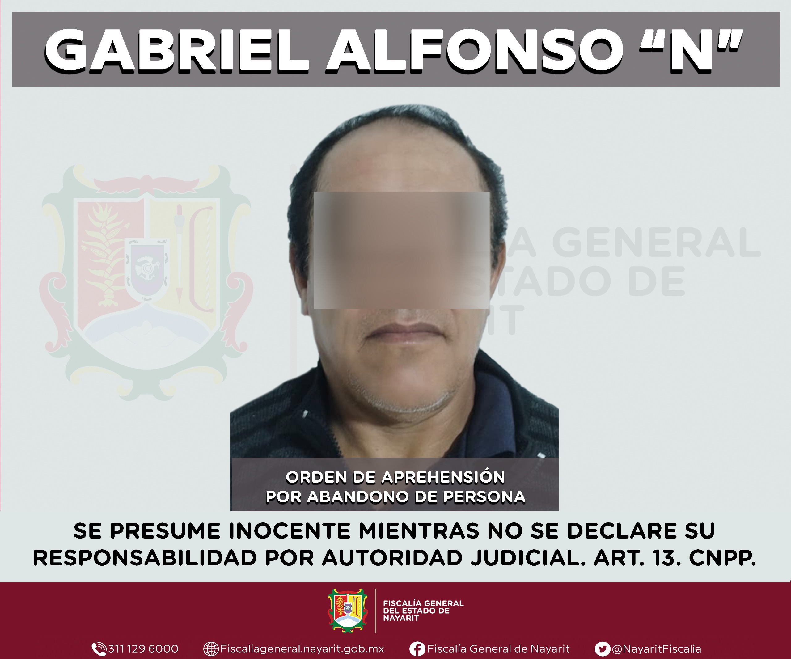 La Fiscalía General de Nayarit a través de la Agencia de Investigación Criminal ejecutó una orden de aprehensión en el municipio de Santiago Ixcuintla contra Gabriel Alfonso “N”, por su presunta participación en hechos que según apreciación de la ley encuadran el delito de abandono de persona, cometido contra una persona de sexo masculino de quien se reserva la identidad con el propósito de salvaguardar su privacidad e integridad.