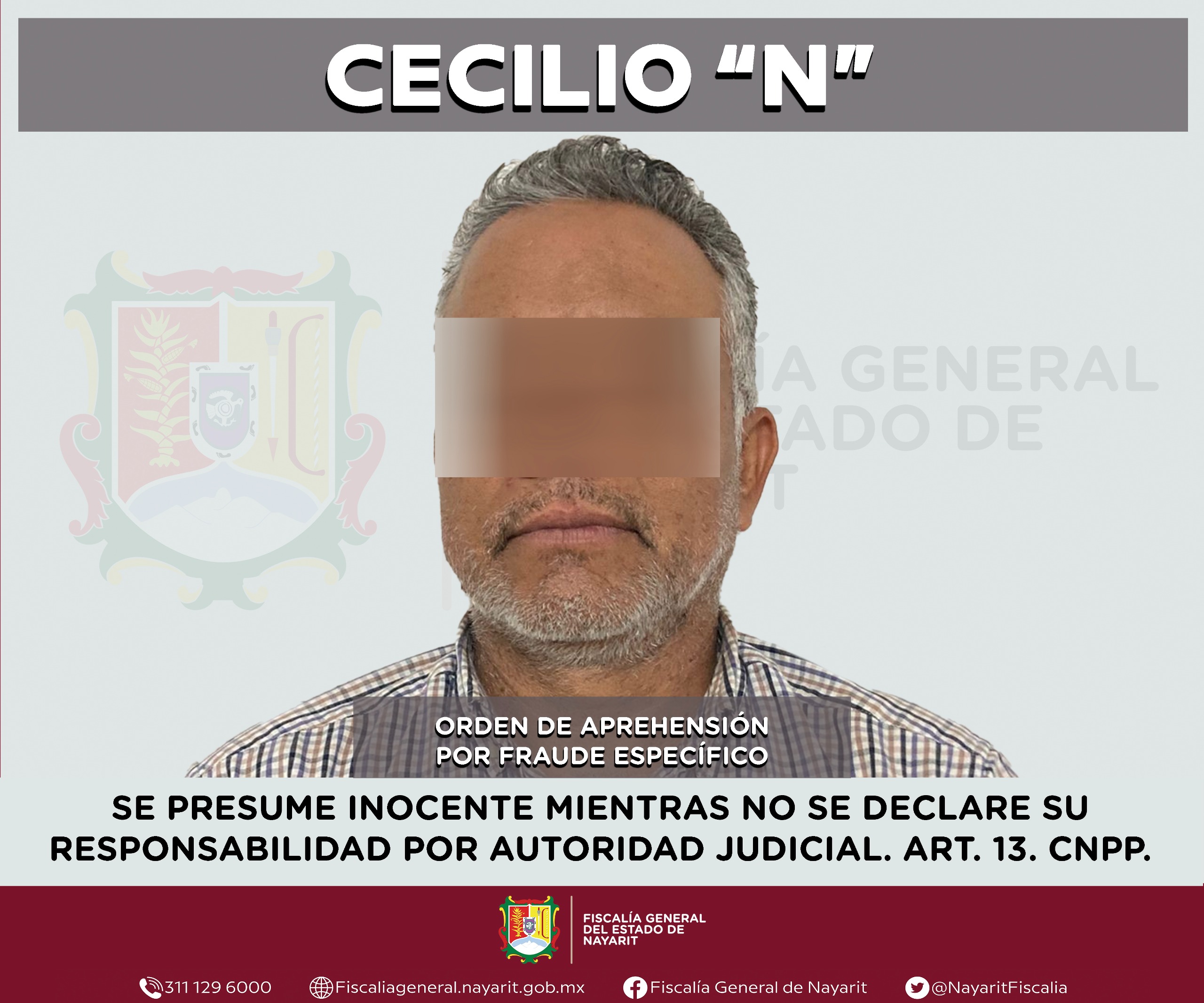 La Fiscalía General del estado de Nayarit a través de la Agencia de Investigación Criminal ejecutó una orden de aprehensión contra Cecilio “N”, por su probable participación en hechos que para la ley configuran el delito de fraude espefífico, en perjuicio de una persona de sexo masculino cuya identidad queda bajo reserva para salvaguardar su privacidad e integridad.