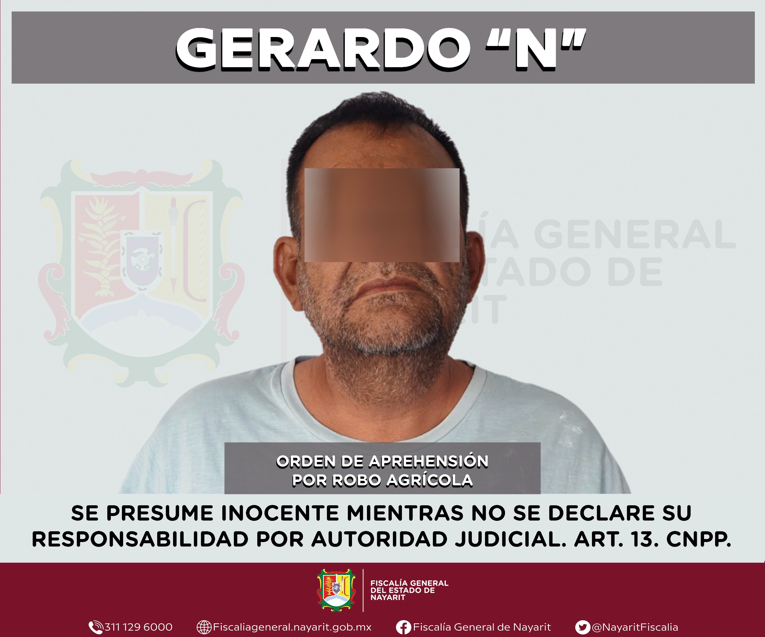 La Fiscalía General de Nayarit a través de la Agencia de Investigación Criminal ejecutó una orden de aprehensión contra Gerardo “N”, por su presunta participación en hechos que según apreciación de la ley encuadran el delito de robo agrícola, cometido contra una persona de sexo masculino de quien se reserva la identidad con el propósito de salvaguardar su privacidad e integridad.
