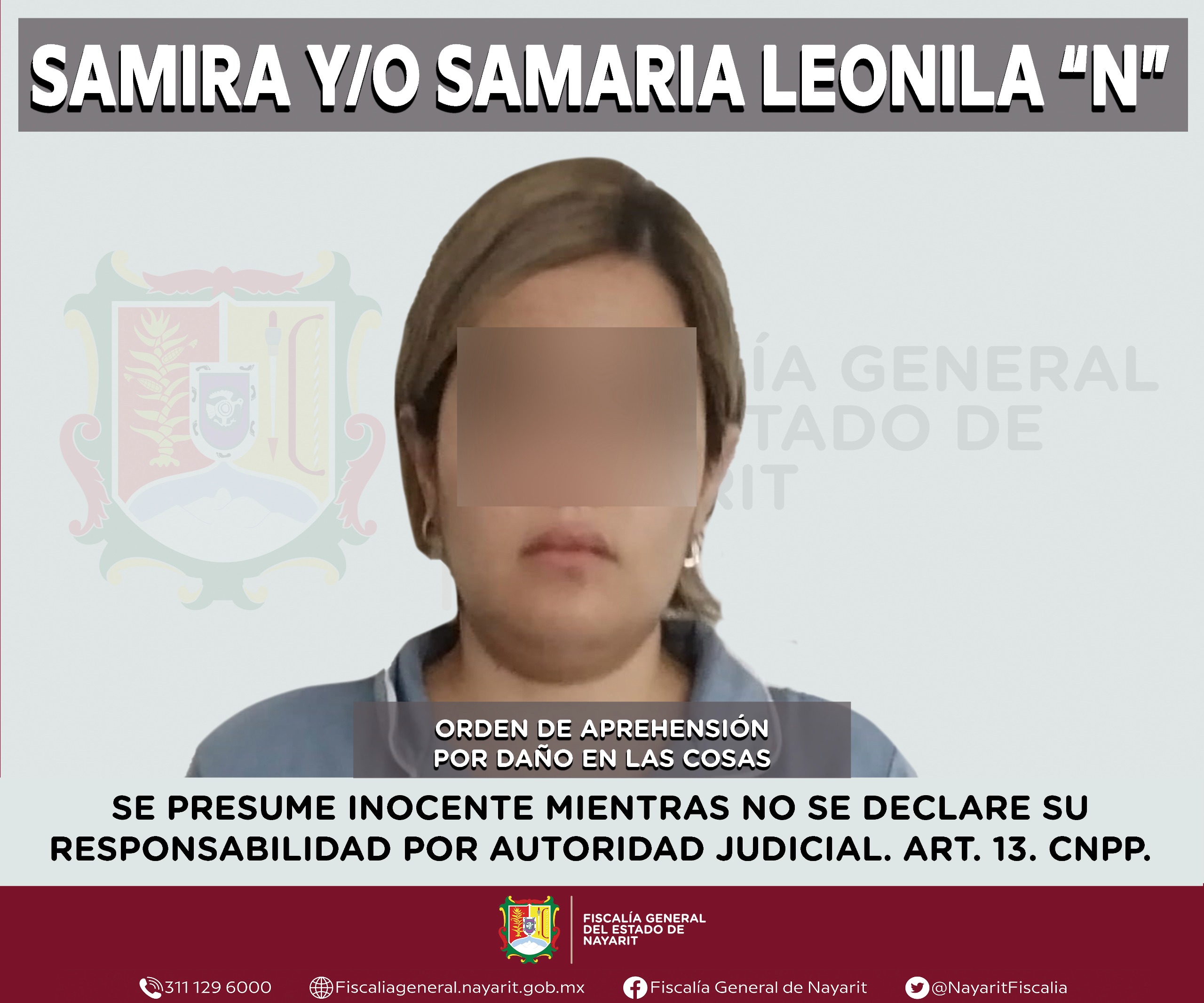 La Fiscalía General de Nayarit a través de la Agencia de Investigación Criminal ejecutó una orden de aprehensión en el municipio de Santiago Ixcuintla contra Samira y/o Samaria Leonila “N”, por su presunta participación en hechos que según apreciación de la ley encuadran el delito de daño en las cosas, cometido contra una persona de sexo masculino de quien se reserva la identidad con el propósito de salvaguardar su privacidad e integridad.