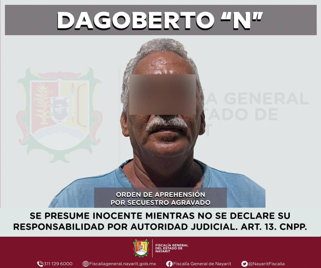 La Fiscalía General de Nayarit a través de la Agencia de Investigación Criminal ejecutó una orden de aprehensión en la localidad El Monteón, municipio de Compostela contra Dagoberto “N”, por su presunta participación en hechos que según apreciación de la ley encuadran el delito de secuestro agravado, cometido contra una persona de sexo masculino de quien se reserva la identidad para salvaguardar su privacidad e integridad.