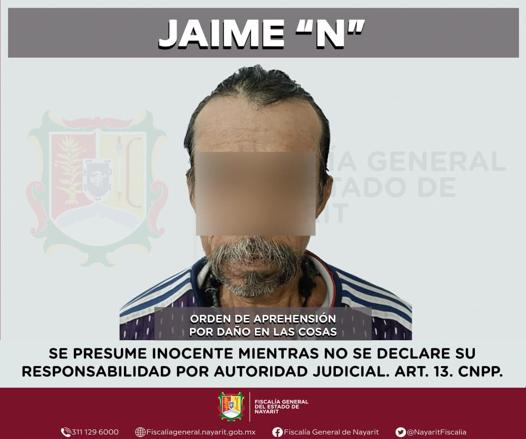 La Fiscalía General de Nayarit a través de la Agencia de Investigación Criminal ejecutó una orden de aprehensión en la localidad San José del Valle, municipio de Bahía de Banderas contra Jaime “N”, por su probable participación en hechos que para la ley configuran el delito de daño en las cosas, cometido contra una persona de sexo femenino de quien se reserva la identidad para salvaguardar su privacidad e integridad.