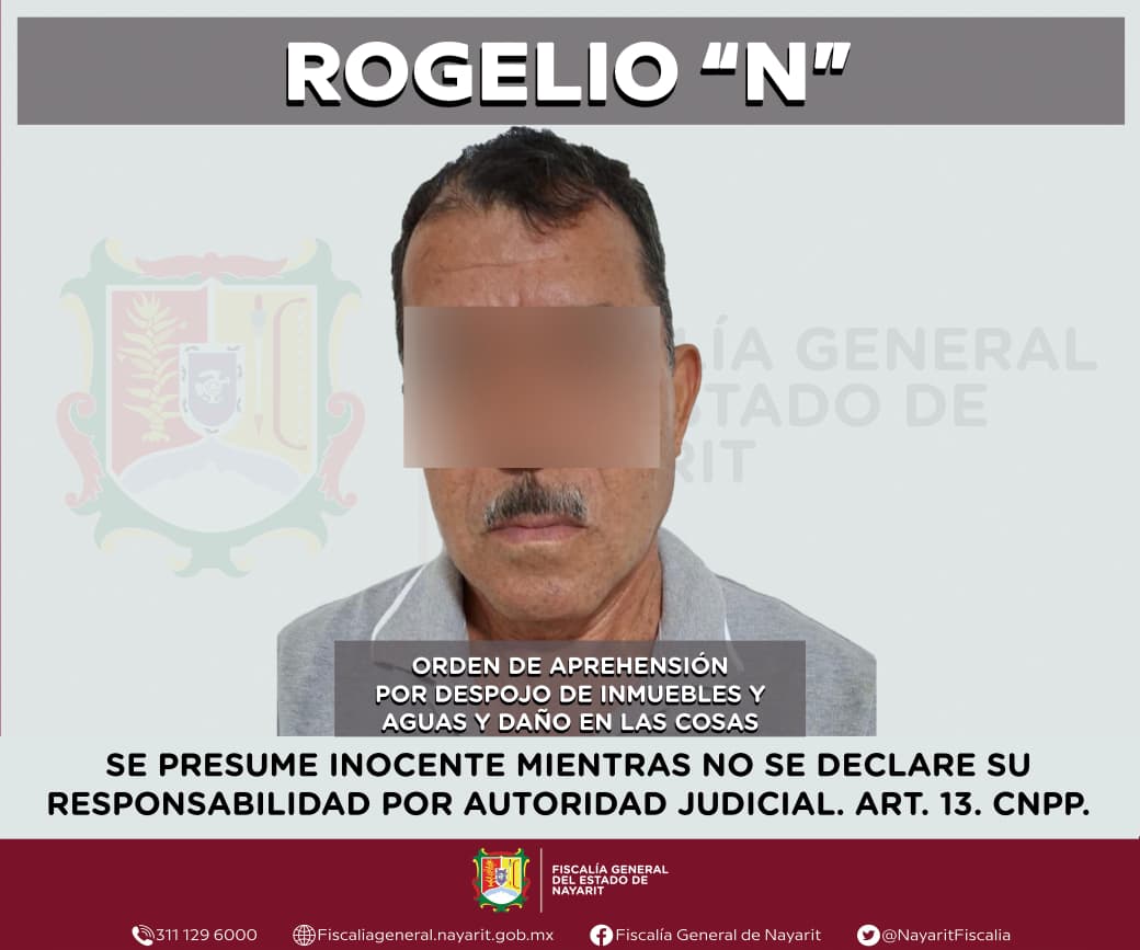 La Fiscalía General de Nayarit a través de la Agencia de Investigación Criminal ejecutó una orden de aprehensión contra Rogelio “N”, por su probable participación en hechos que para la ley configuran los delitos de despojo de inmuebles y aguas y daño en las cosas, siendo reservada la identidad de la víctima para salvaguardar su privacidad e integridad.