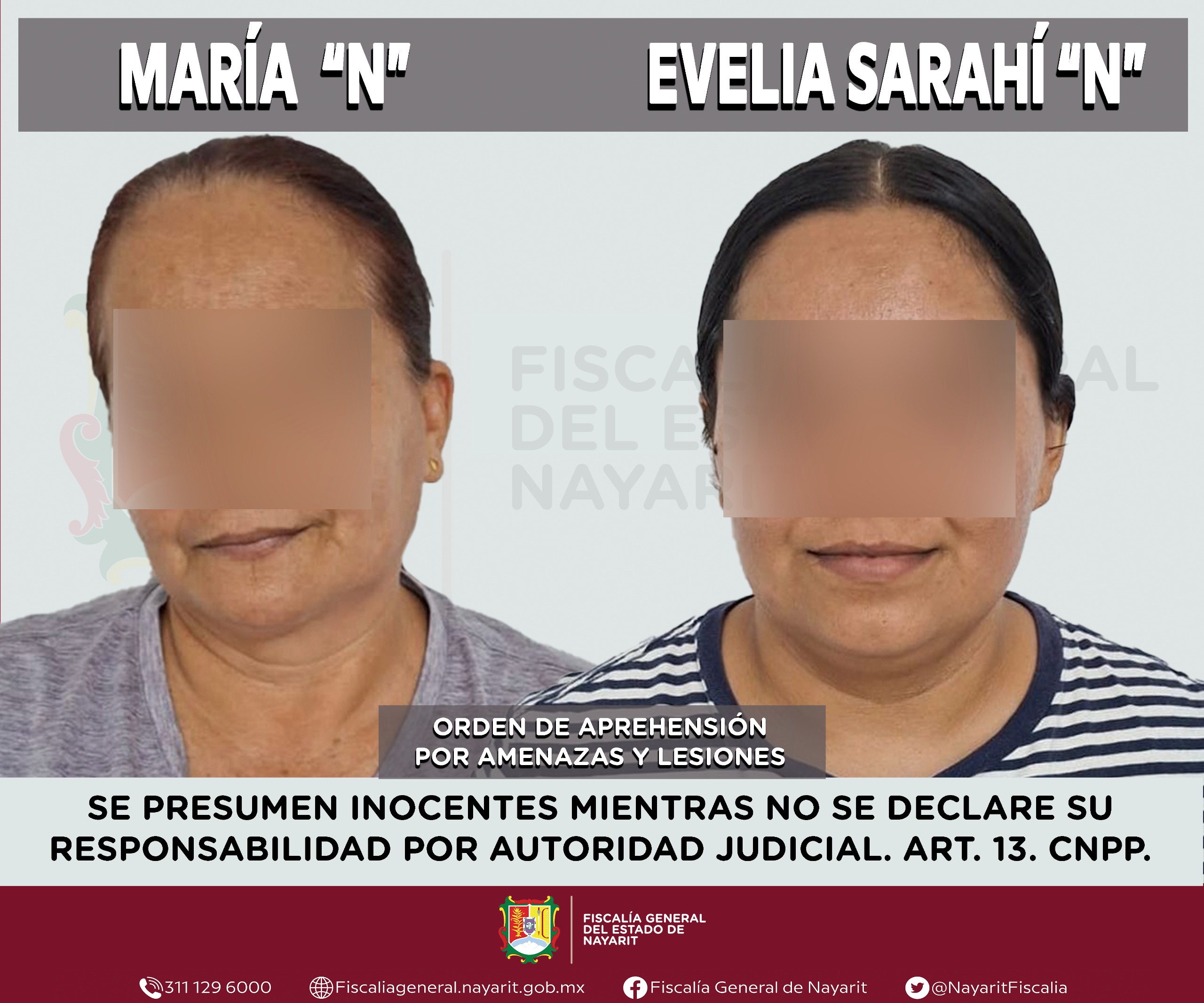 Elementos de la Agencia de Investigación Criminal de Nayarit ejecutaron una orden de aprehensión en la localidad Las Varas, municipio de Compostela contra Evelia Sarahí “N” y María “N”, por su probable participación en hechos que para la ley configuran los delitos de amenazas y lesiones, la identidad de la víctima se reserva para salvaguardar su privacidad e integridad.